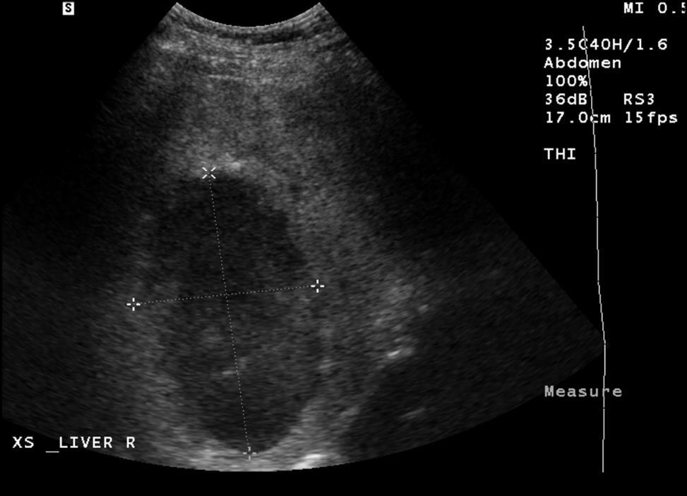 Ultrasound appearance did not support Hepatic tumor or Echinococcal Cyst.