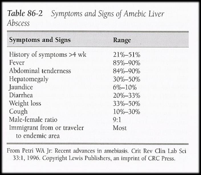 • “Serological testing for E. histolytica was highly specific and sensitive for amoebic liver abscess.” 2