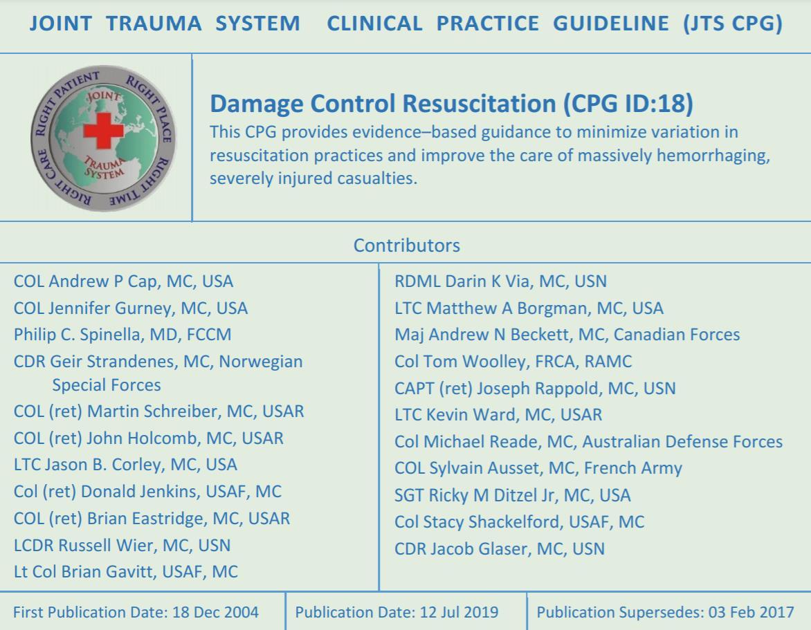 Trends in Traumatology gives a summary of the Joint Trauma System’s Damage Control Resuscitation (DCR) clinical practice guidelines. These guidelines are a superb resource for the austere advanced medical practitioner caring for severe trauma patients, and readers can look forward to the highlights of these guidelines finding their way into the next edition of the CoROM Field Guide, which I hope to begin work on next year.
