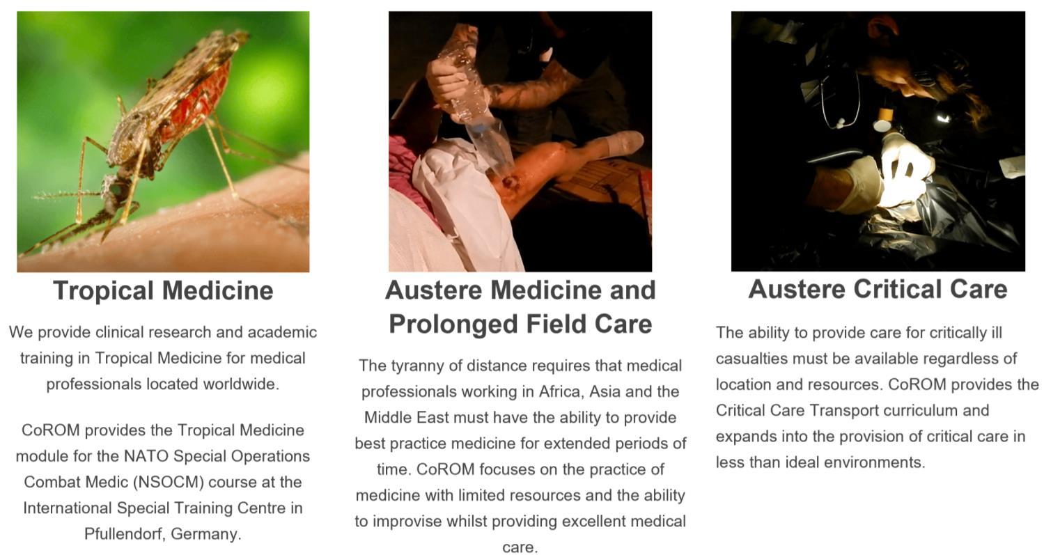 CoROM provides the Tropical Medicine module for the NATO Special Operations Combat Medic (NSOCM) course at the International Special Training Centre in Pfullendorf, Germany.