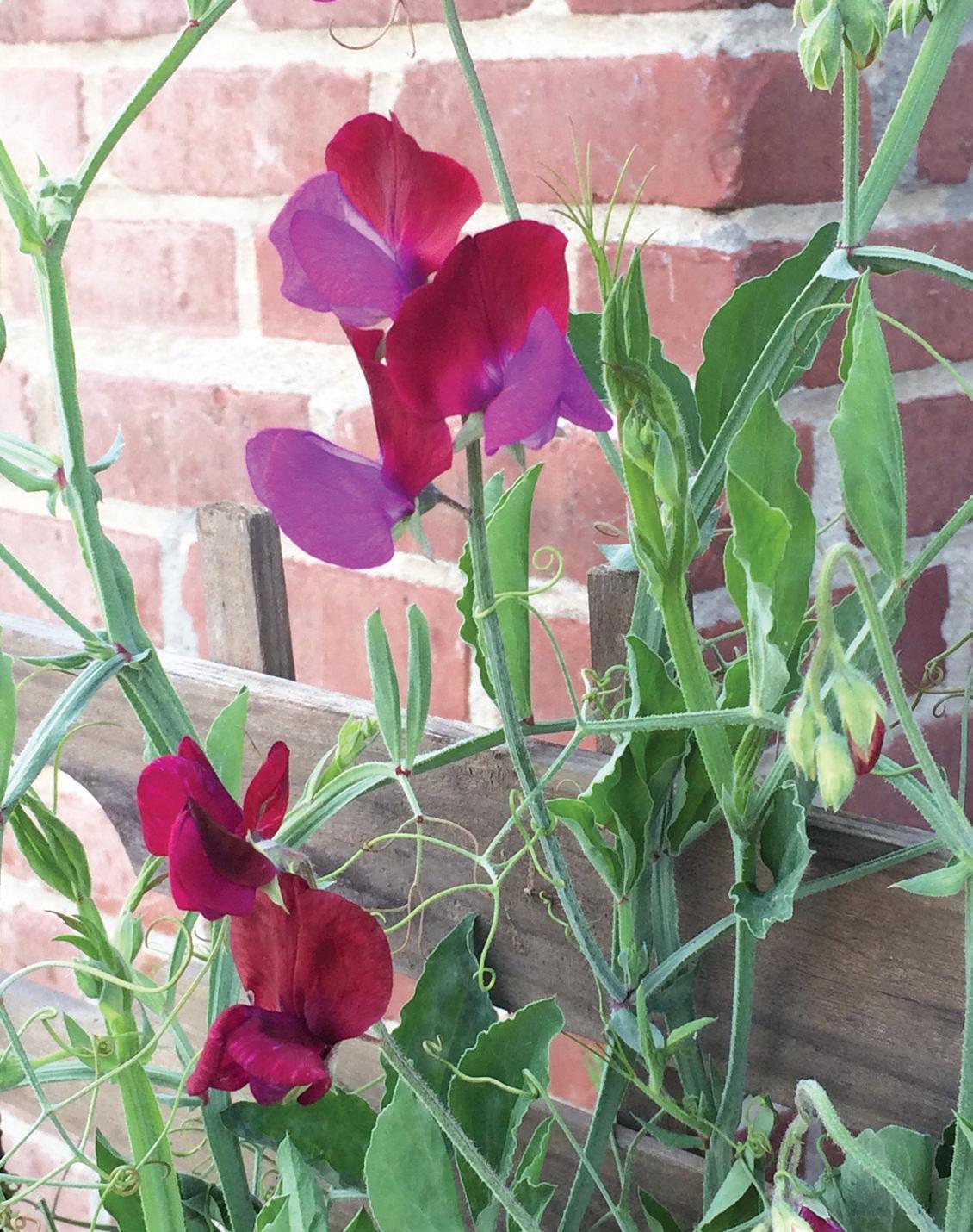 Ladybugs are beneficial in the garden, keeping aphids in check. Sweet peas (left) are easy to grow and so satisfying when they bloom in the spring. Continuous clipping of flowers will promote a longer blooming period.