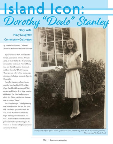 Navy Daughter. Community Cultivator. By Kimberlie Guerrieri, Coronado Historical Association Research Volunteer If you’ve visited the Coronado Historical Association, strolled Artisans Alley, or marveled at the floral arrangements at the Coronado Flower Show, you can thank long-time Coronado resident Dorothy “Dodo” Stanley. These are just a few of the many organizations she helped start and shape in Coronado. Dorothy Stanley was born in Annapolis, Maryland in 1933 to Navy Capt. Cecil B. Gill, a native of Wisconsin, and Evelyn de la Nux, a native of Hawaii. The third and youngest child, her father gave her the diminutive nickname “Dodo.” The Navy brought Dorothy’s family to Coronado when she was five years old. Her father graduated from the U.S. Naval Academy in 1925 and flight training school in 1929. He was a member of the stunt team that preceded the Navy’s Blue Angels. He went on to become a highly decorated career naval officer. Dorothy stands in front of the Colonial Apartments at Olive and D during World War II. They were the first renters. Photo courtesy of the Stanley Family
