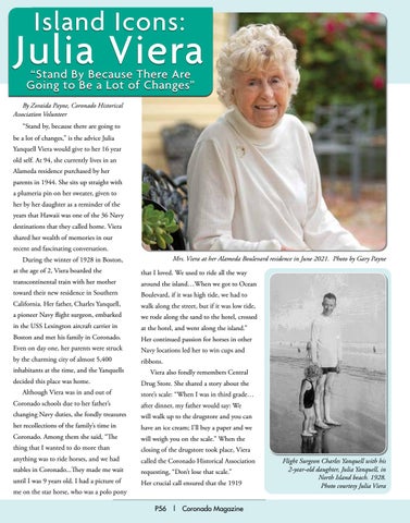 By Zoraida Payne, Coronado Historical Association Volunteer “Stand by, because there are going to be a lot of changes,” is the advice Julia Yanquell Viera would give to her 16 year old self. At 94, she currently lives in an Alameda residence purchased by her parents in 1944. She sits up straight with a plumeria pin on her sweater, given to her by her daughter as a reminder of the years that Hawaii was one of the 36 Navy destinations that they called home. Viera shared her wealth of memories in our recent and fascinating conversation. Mrs. Viera at her Alameda Boulevard residence in June 2021. Photo by Gary Payne