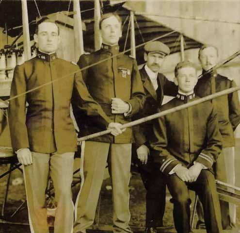 Glenn Curtiss (with hat) and his first class of military pilots, from left Lt. J.C. Walker, U.S. Army; Lt. P.W.Beck, U.S. Army, Lt.Theodore G “Spuds” Ellyson, U.S. Navy and Lt. G.E. Kelly, U.S. Army.