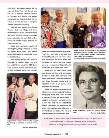 from SDSU and taught Spanish for six years at Chula Vista High School; she was also a Spanish substitute teacher in Coronado. As a teacher, she always encouraged her students to look for the details in Spanish literature by using the Socratic method of questioning. Saturday night dancing at the Crown Dancing Club was Midge and Jim’s favorite night out; it was a dressy evening with dinner first and then dancing to live band music at the Woman’s Club on The Strand with 50 other couples. She and Jim loved the Cha-Cha. Midge also has fond memories of attending Navy League meetings on Naval Air Station, North Island, and leading