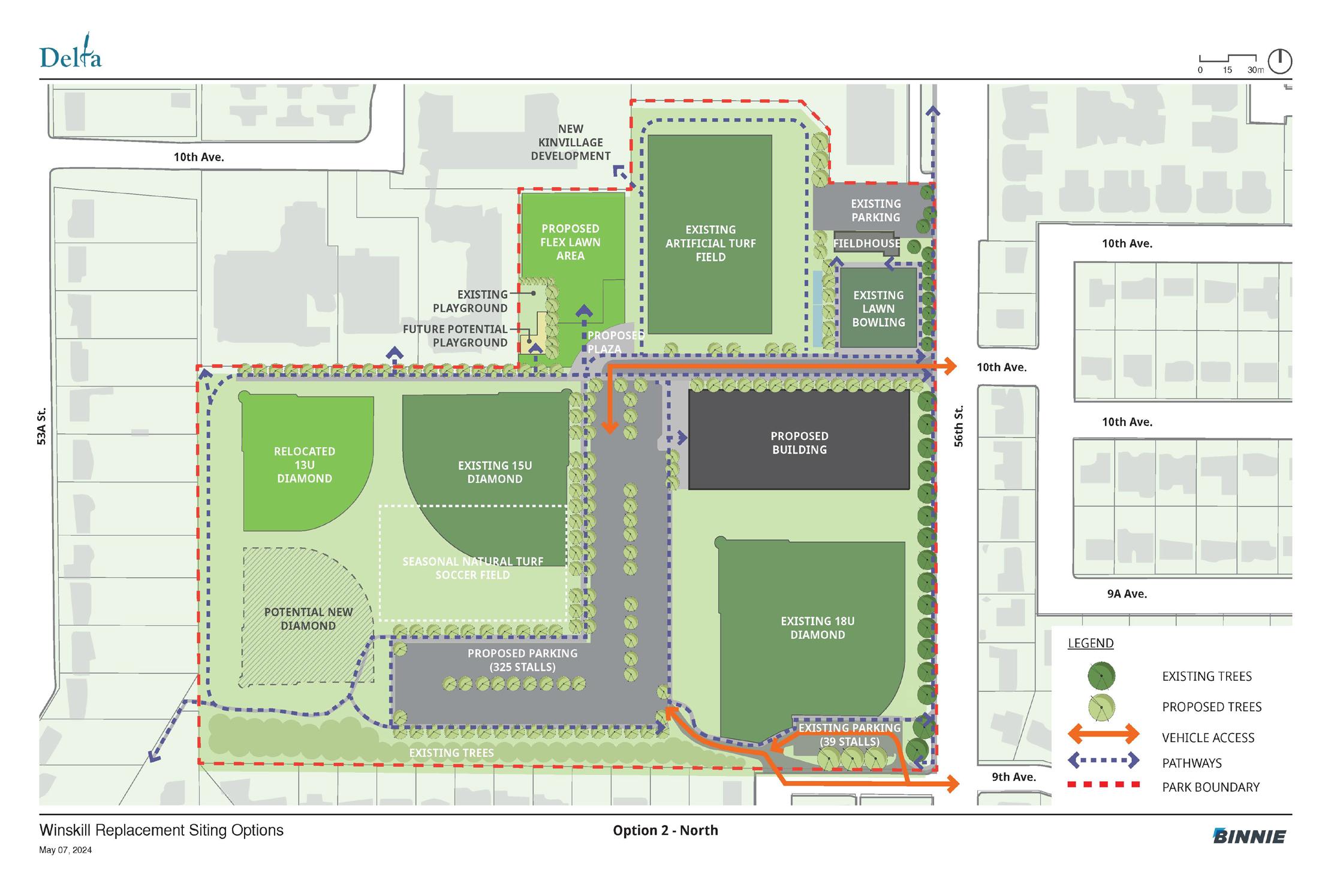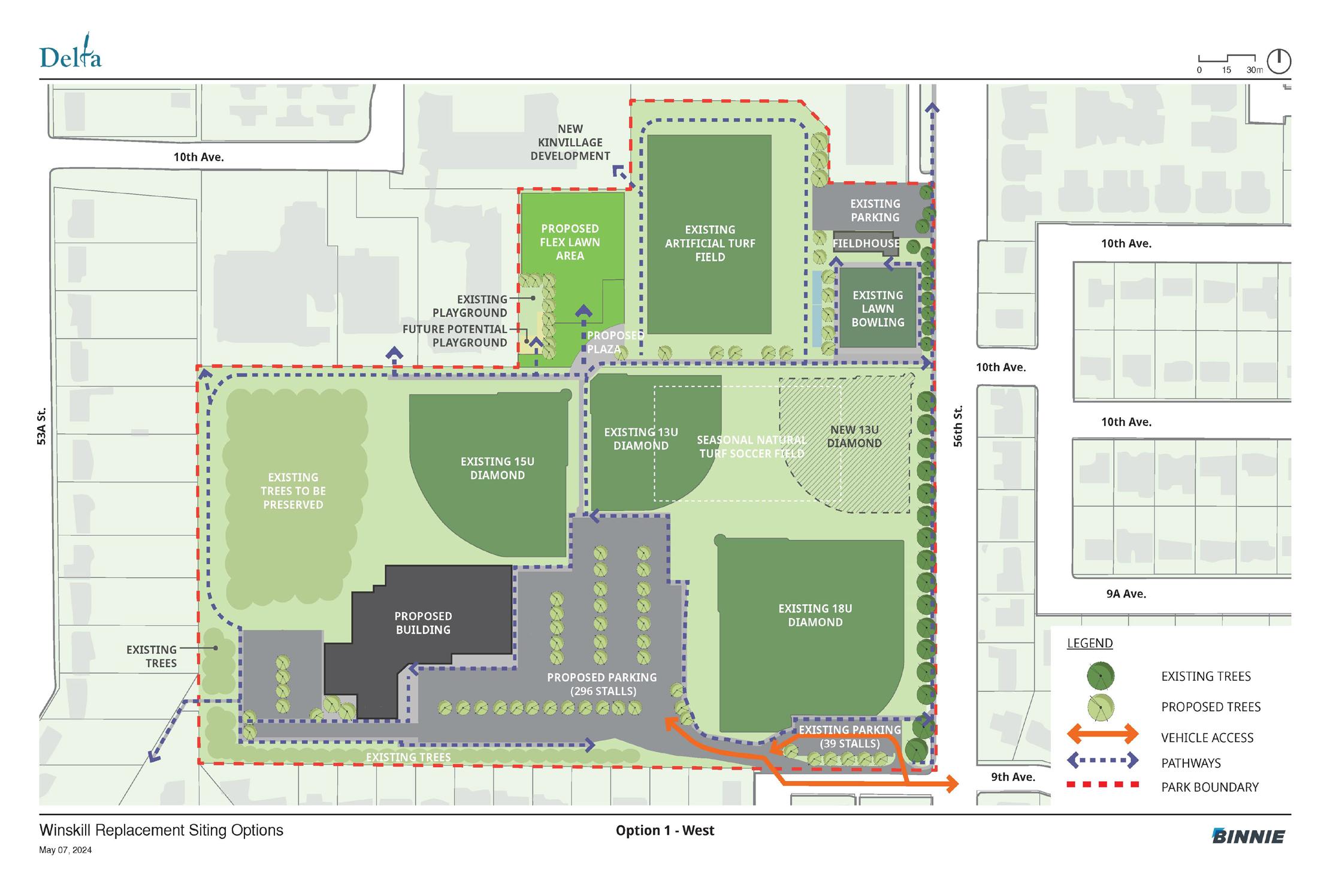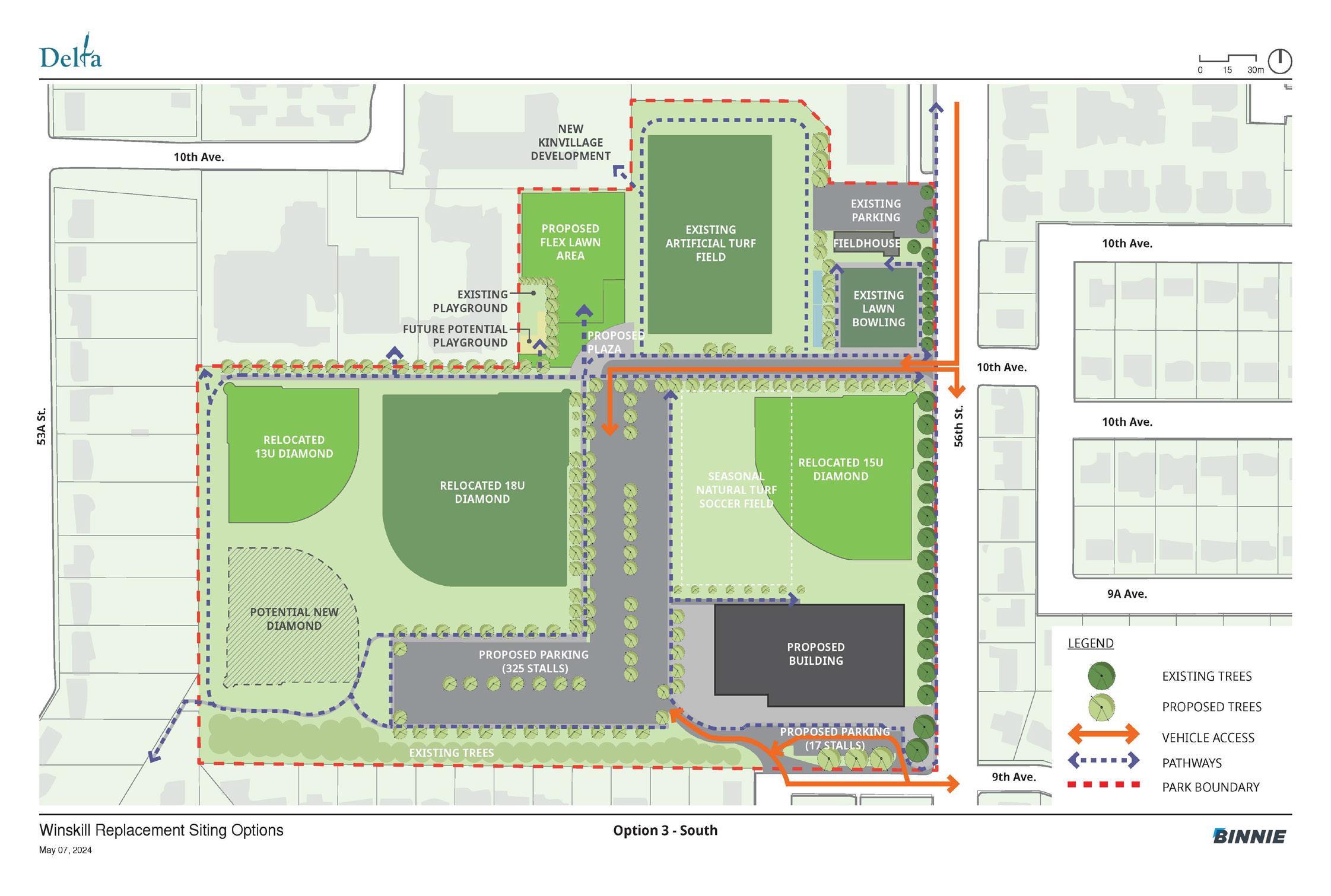 One of the most important questions we are asking is where to locate the new facility on the current site. There are three locations being considered. The following chart summarizes some of the key differences between the options including: parking design, road access, tree impacts, ball diamond locations, disc golf course, and more. Review the differences and potential impacts and let us know what your preference is on the feedback form at letstalk.delta.ca/Winskill. Visit the website to see a diagram of the current site and the options in closer detail.