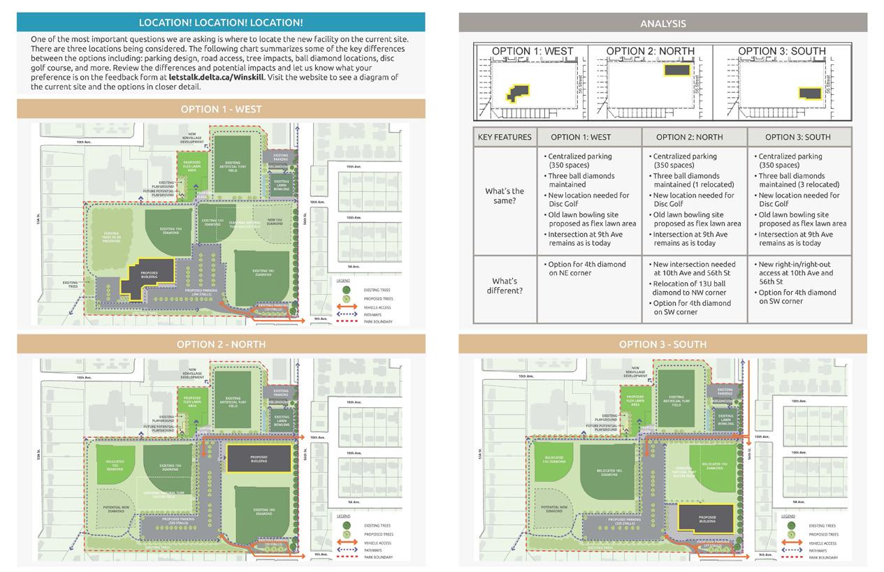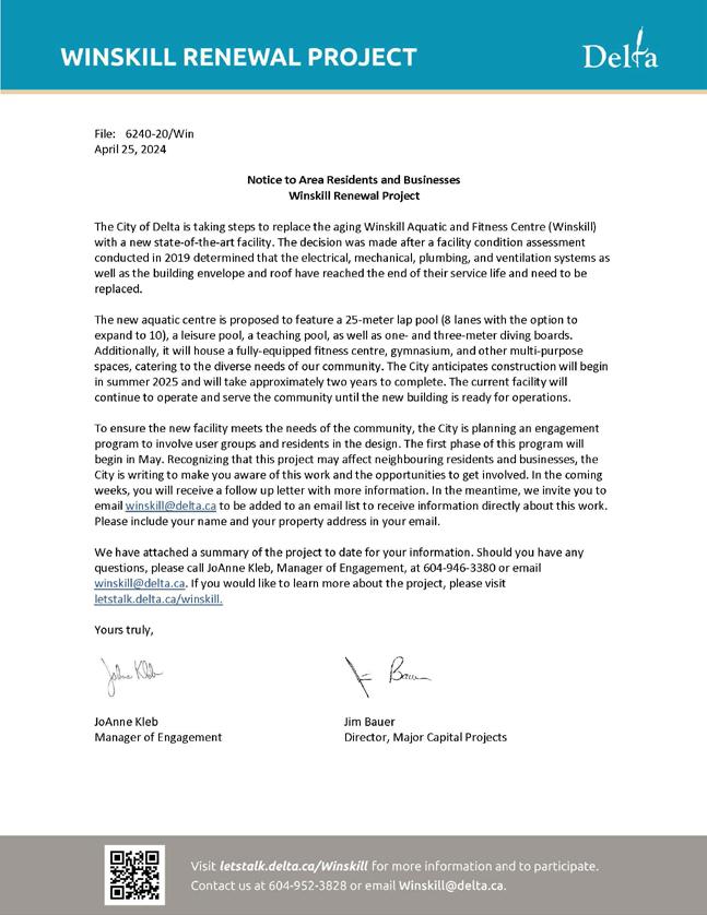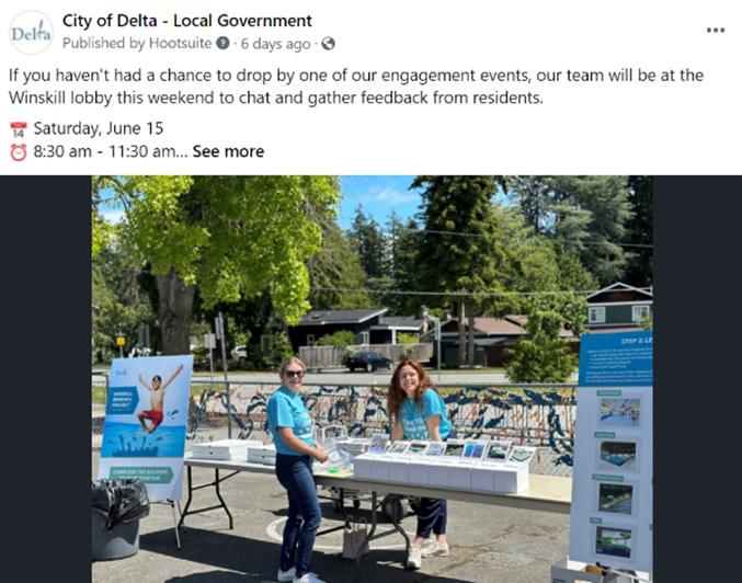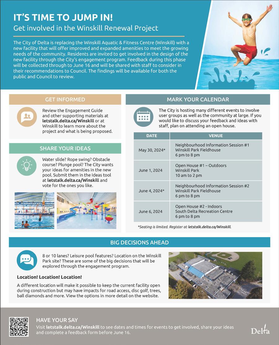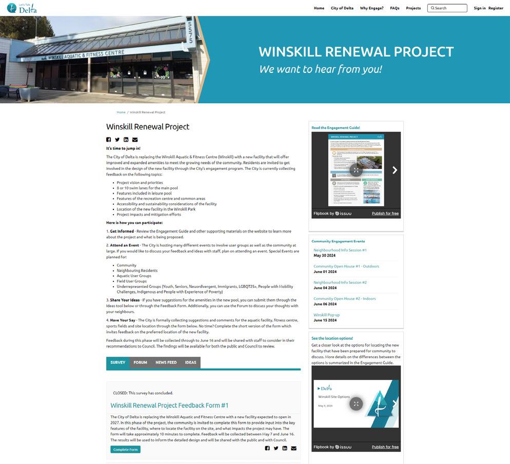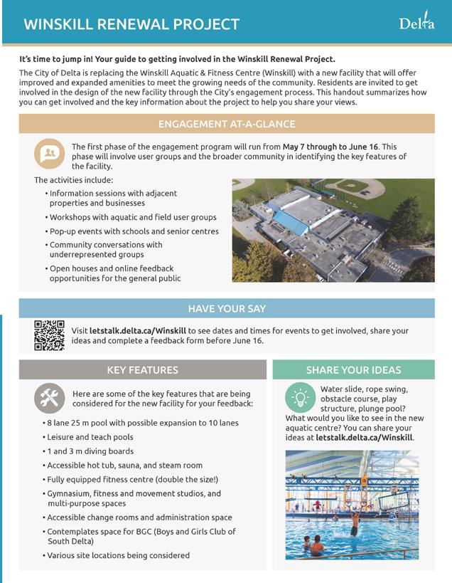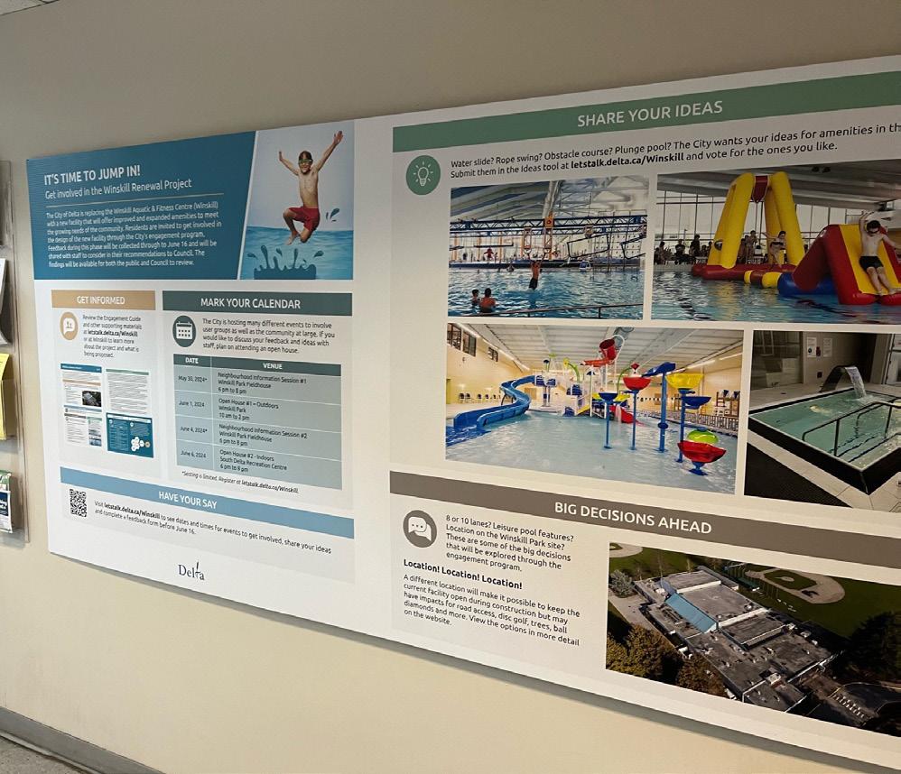 Council directed staff to undertake a community engagement program to involve residents in plans for the new Winskill Aquatic and Fitness Centre. The first phase was conducted between March 6 and June 27, 2024 and invited residents to share their views on key features of the facility. The program gathered a wealth of feedback on a range of topics and the complete findings are included in this report and at letstalk.delta.ca/Winskill. The top six findings are highlighted here:
