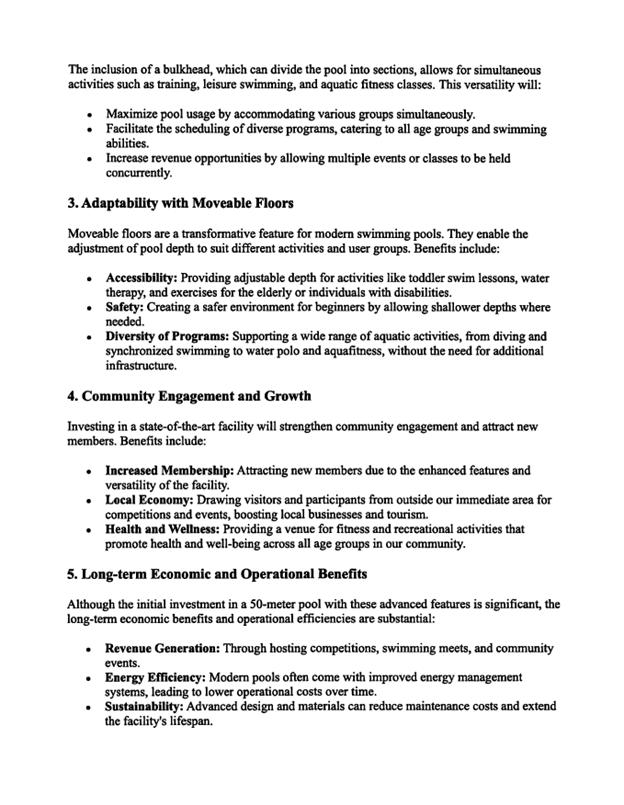 Fun was also at the top of the list of amenities participants would like to see in the pool with a water slide receiving the most support of the eight options suggested. Wellness was also prominent with a lazy river and a cold plunge pool taking the second and third spots. A desire to see the facility support rehabilitation and therapy was also prominent in the comments.