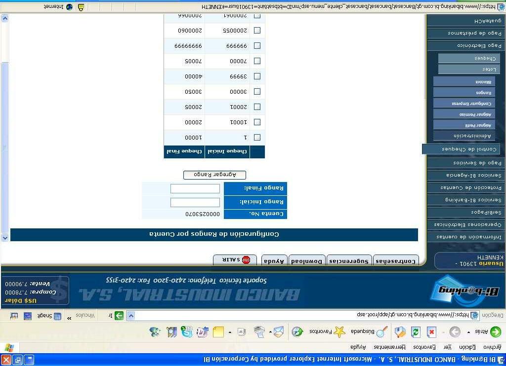 Los rangos de cheques consisten en la posibilidad de crear segmentos para los cheques creados, si una cuenta posee un rango de 1 a 100 cheques, solo estos cheques podrán ser validados y autorizados en el sistema de Banco Industrial. Primeramente deberá seleccionar la cuenta a asignarle los rangos, posteriormente usted podrá ingresar el número inicial y final en la cual será válido el rango de sus cheques. Estos números deben de ser números enteros positivos, y no existentes entre rangos ya configurados para esas cuentas.