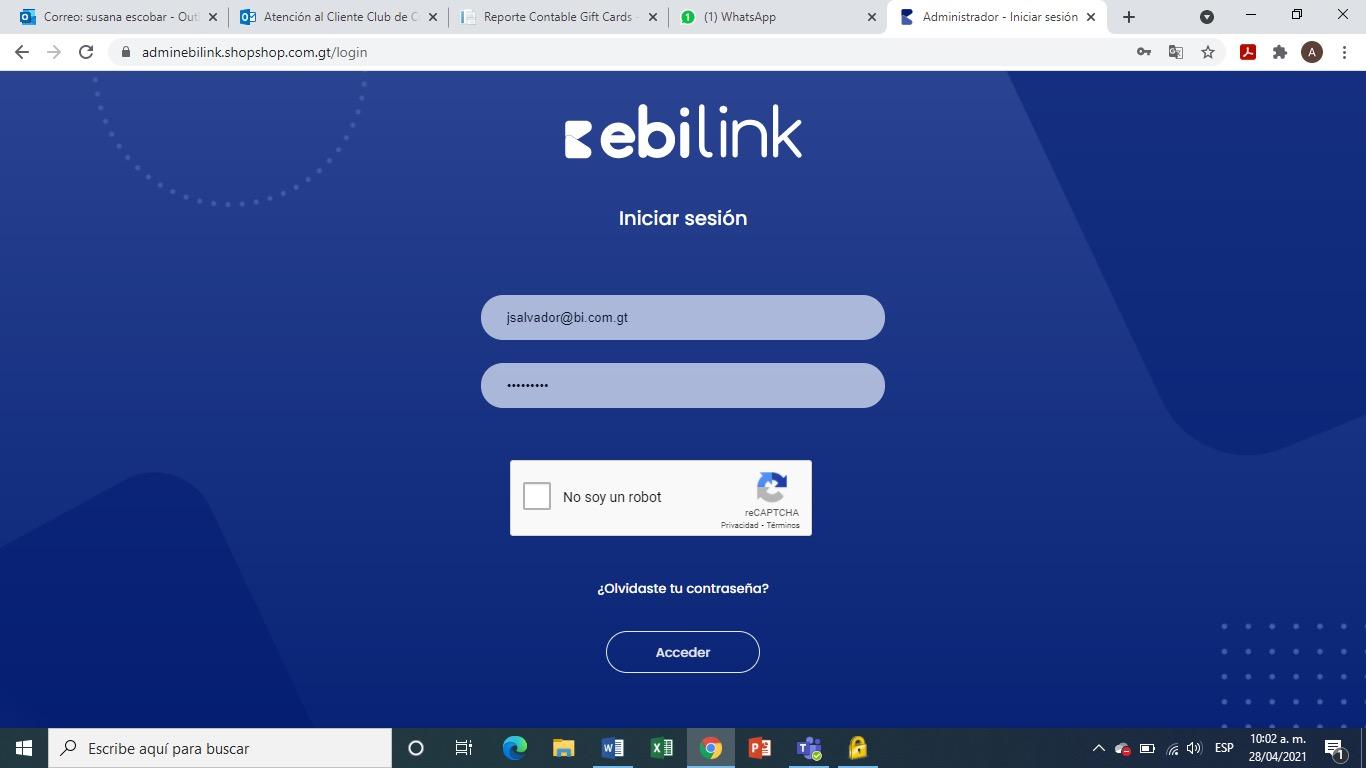 Inicio con usuario (correo electrónico), contraseña y mediante un validador captcha permite el ingreso.