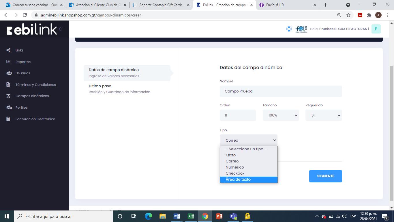Requerido: Si (si/no deseas que sea un campo obligatorio en los datos que se generan en el link para que el cliente complete)