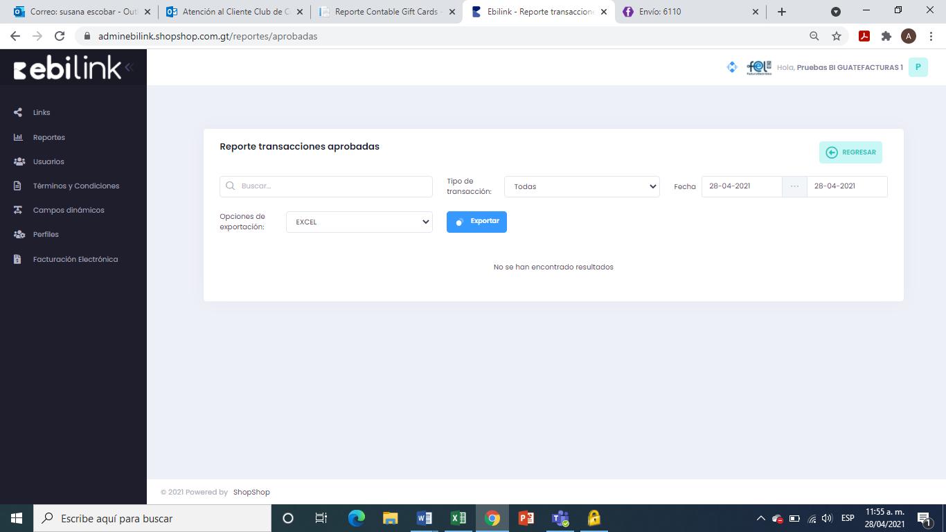 Permite visualizar por rangos de fechas y exportar el reporte de transacciones aprobadas.