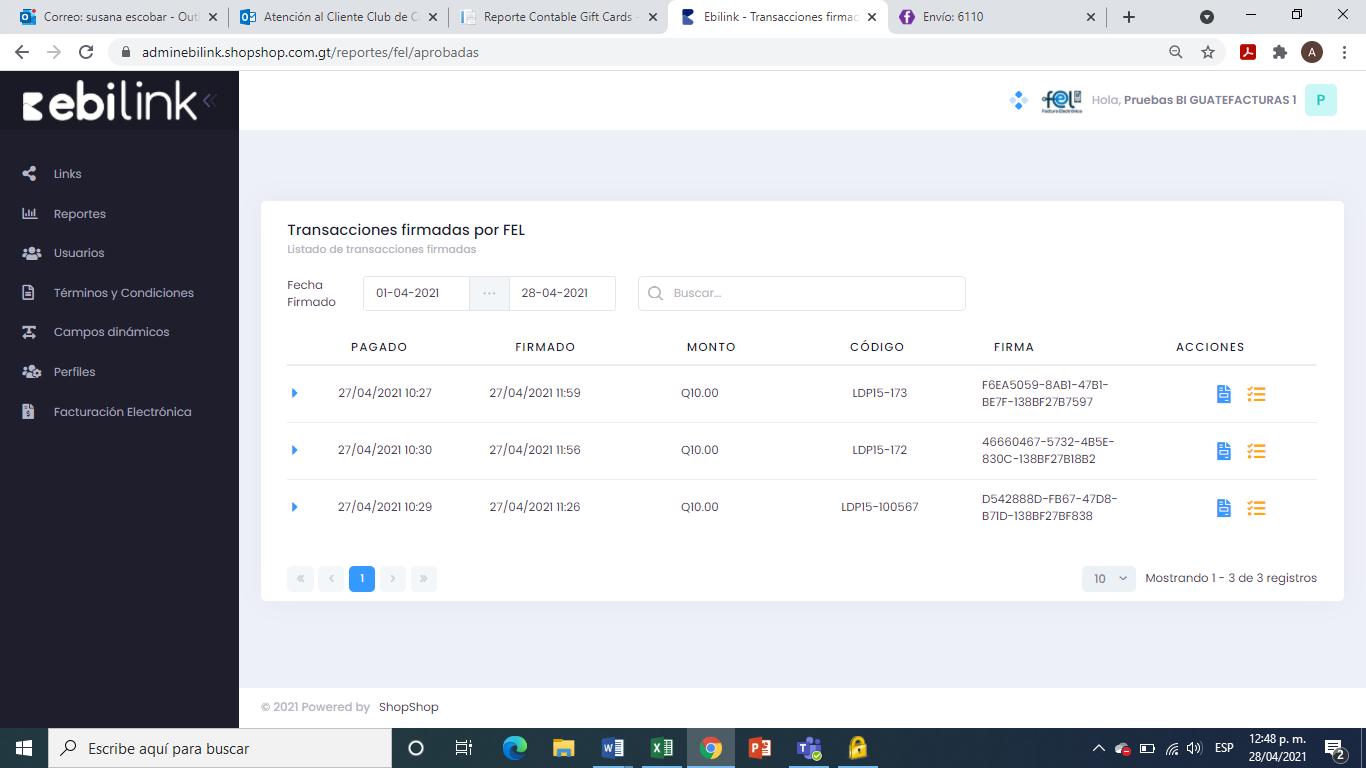 Permite la búsqueda de transacciones firmadas por FEL, por filtro de fechas visualizando la factura en las acciones y viendo detalles de la misma.