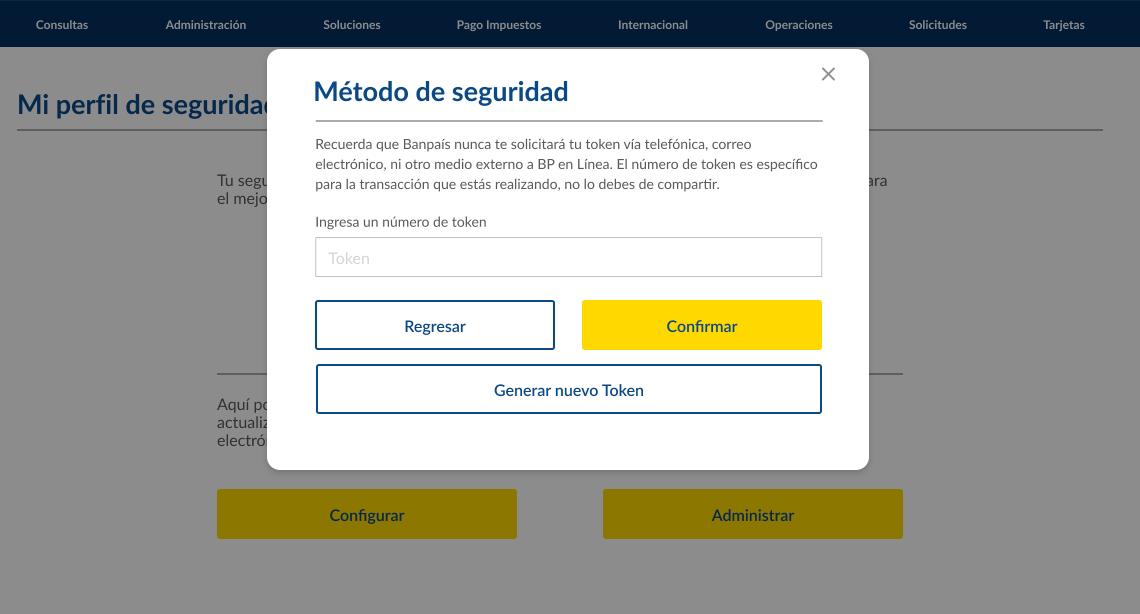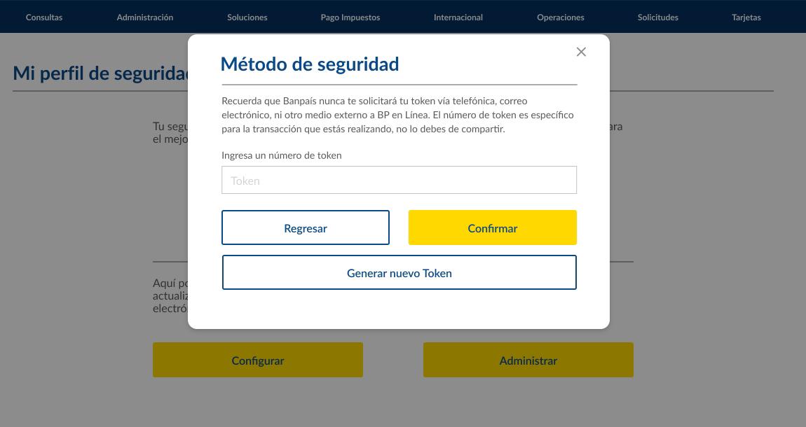 Te pedirá un token, el mismo puede ser SMS, soft token o físico, ingrésalo y haz clic en Confirmar.