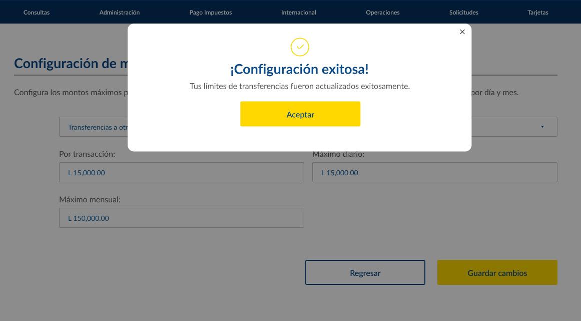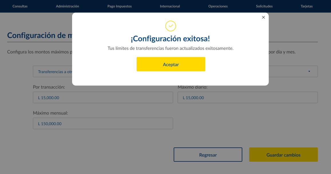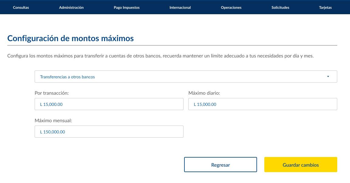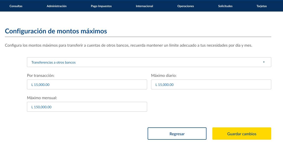 En la pantalla Configuración de montos máximos, podrás definir los montos máximos que deseas asignar por transacción, diario y mensual. Cuando los hayas definido, haz clic en Guardar cambios.