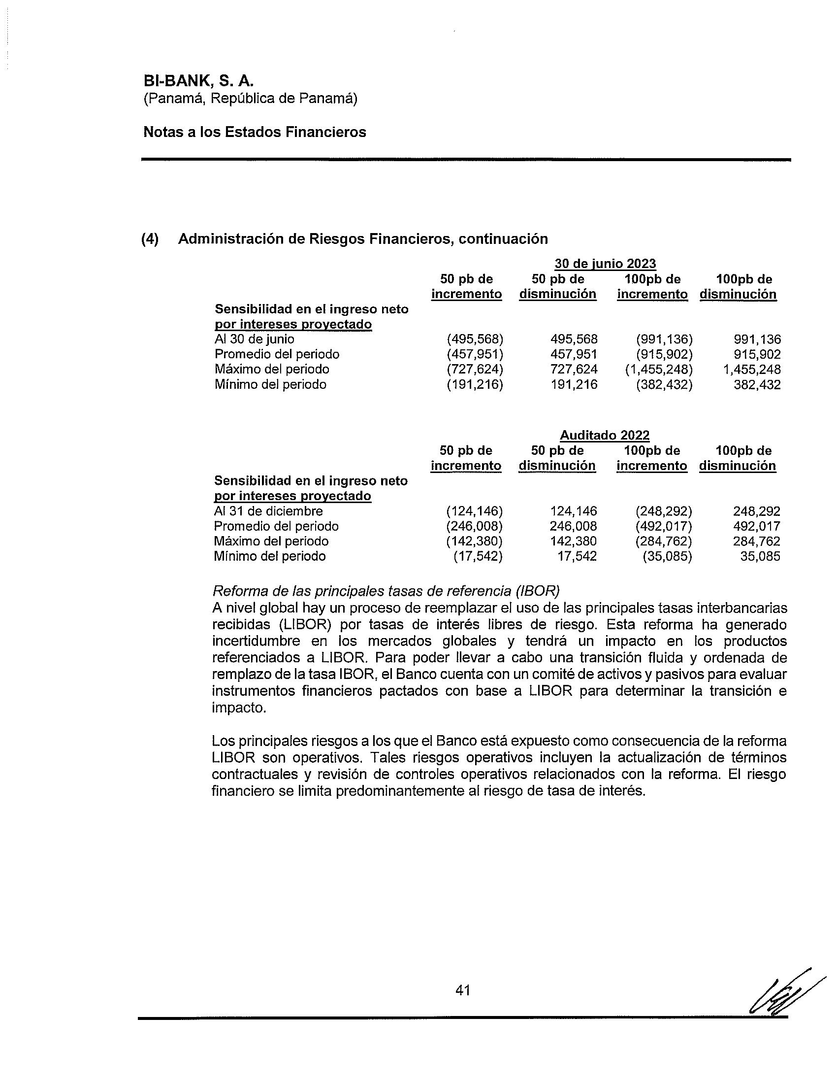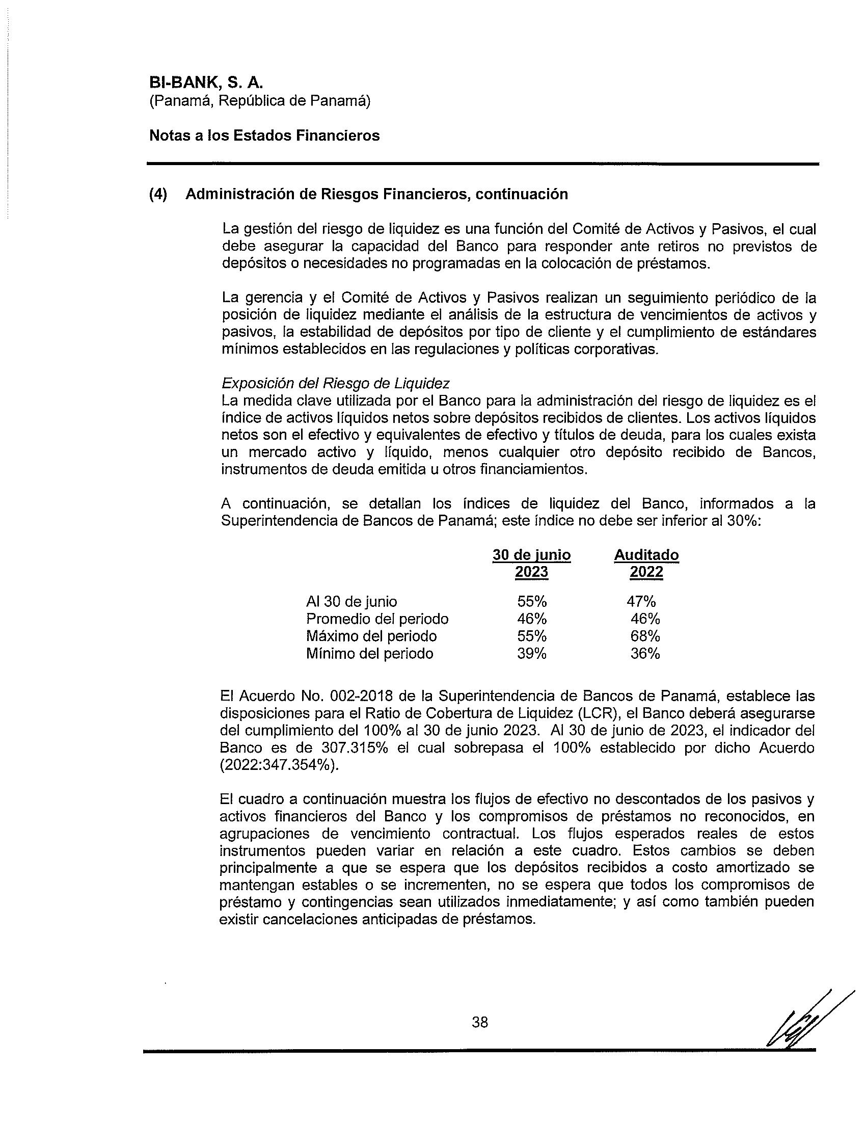 e BI BANK Índice de Liquidez 31 de diciembre 2022 30 dejuni Al cierre 47% 55% Promedio del período 46% 46% Máximo del periodo 68% 55% Mínimo del periodo 36% 39%