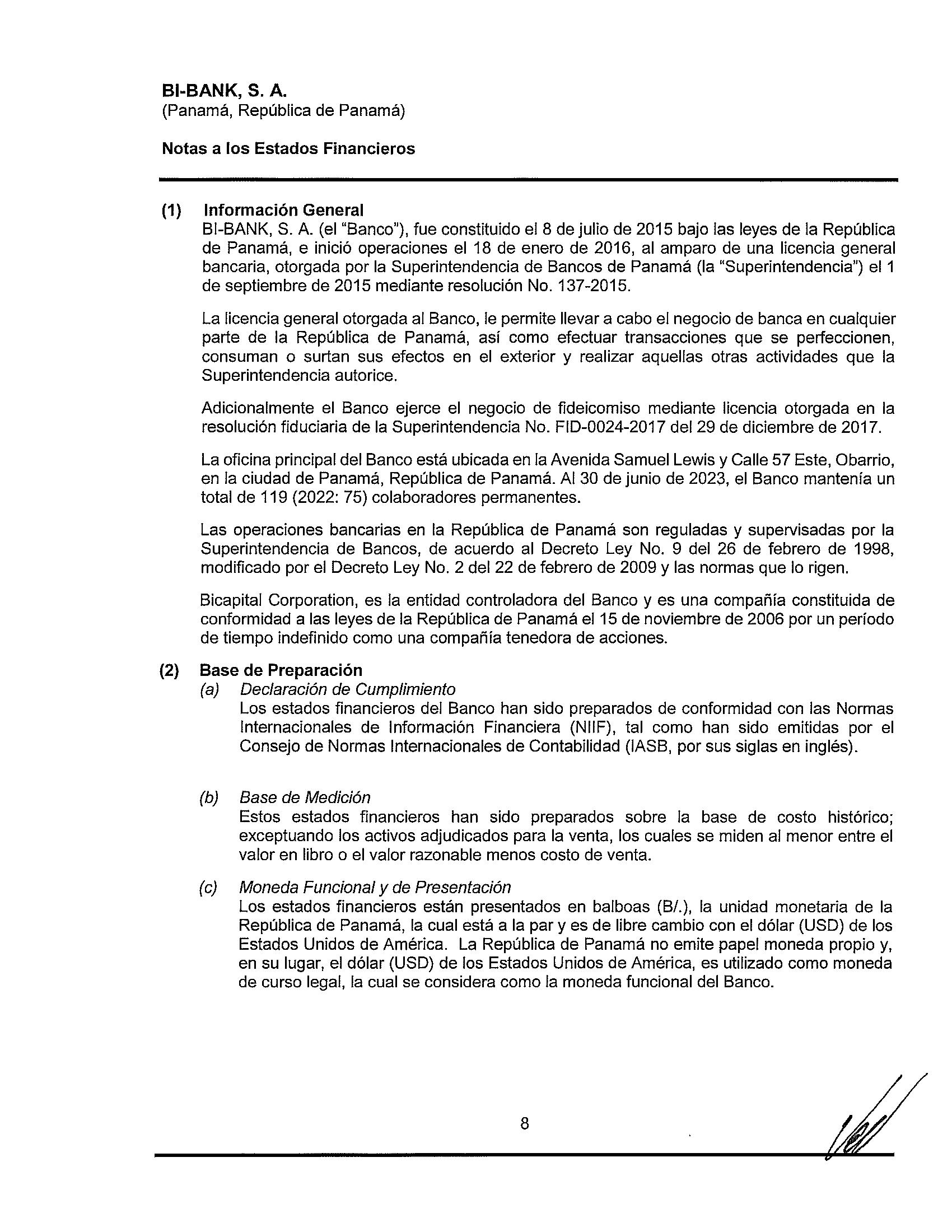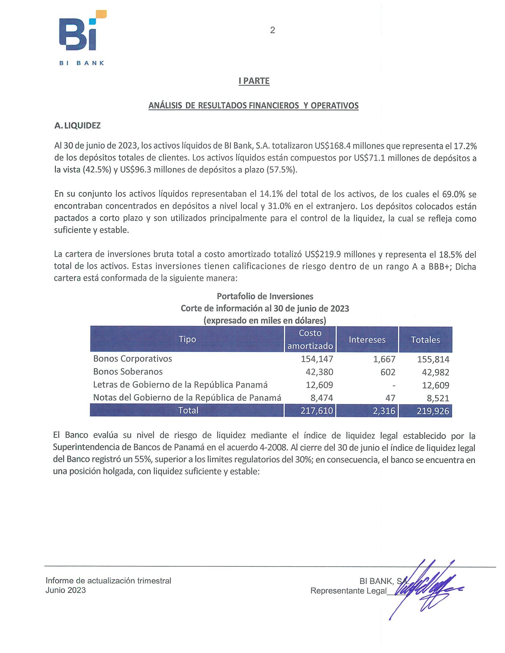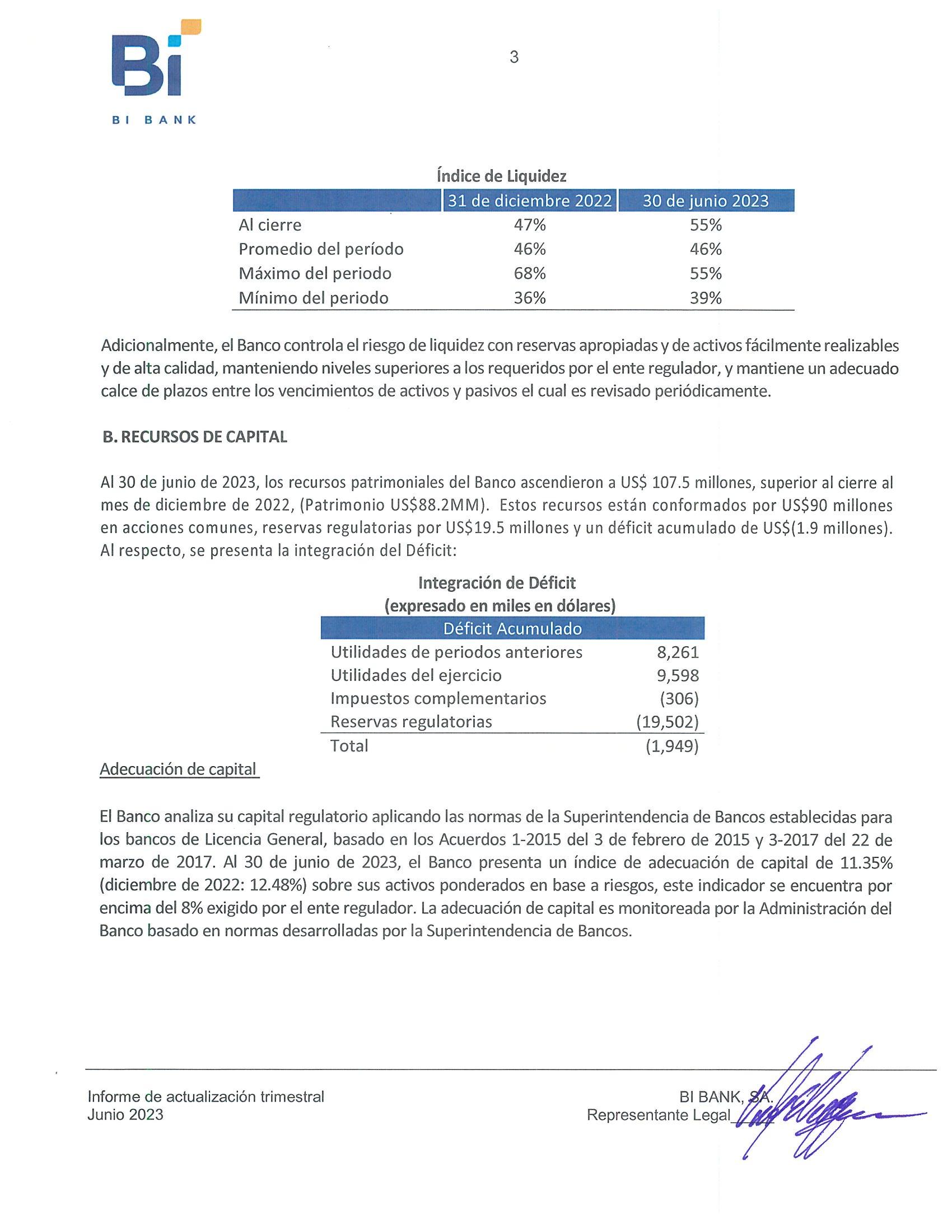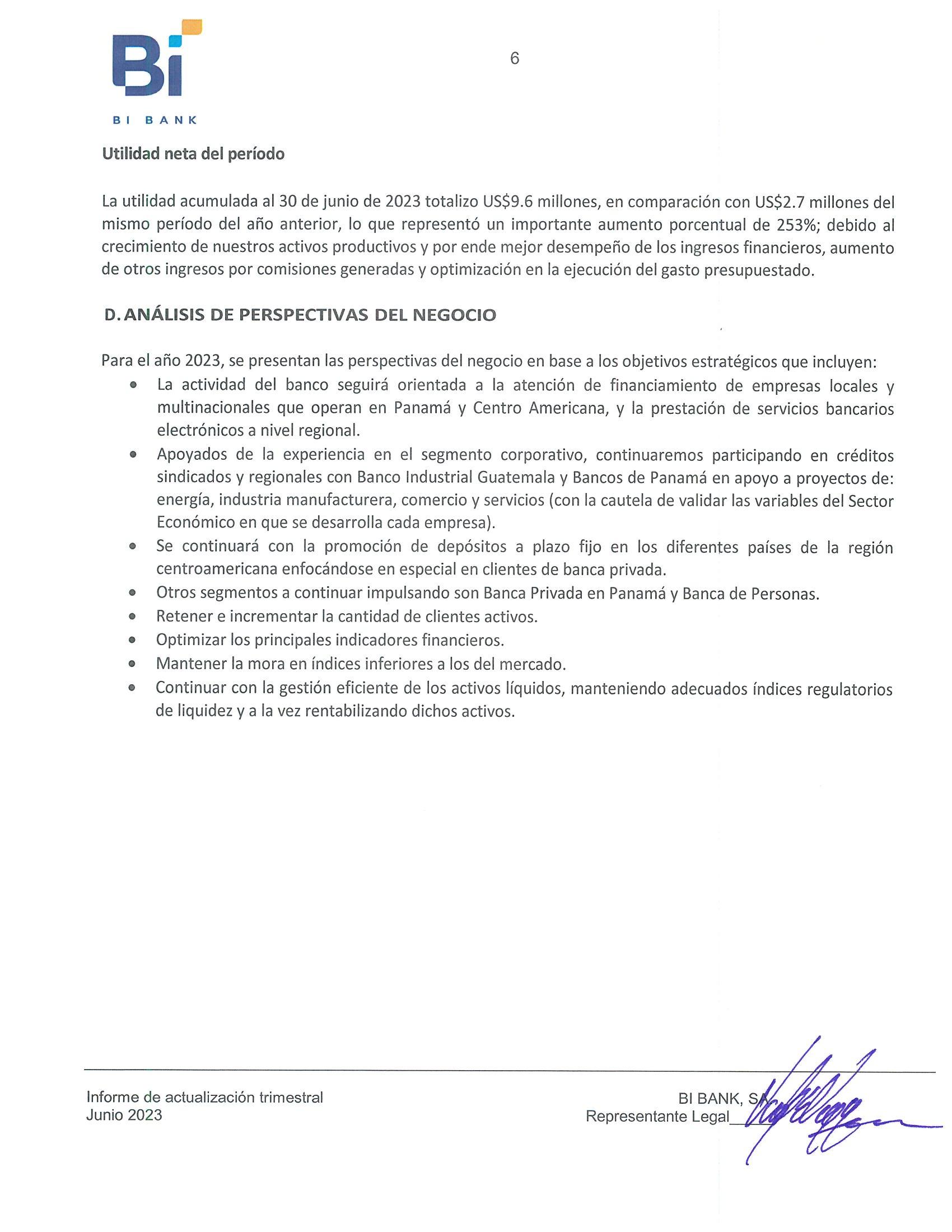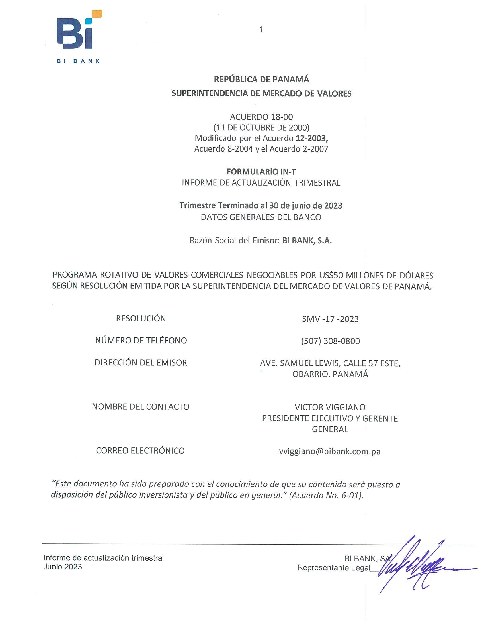 Informe de actualización trimestral BI BANK, 8 Junio 2023 Representante Legal ,t / e