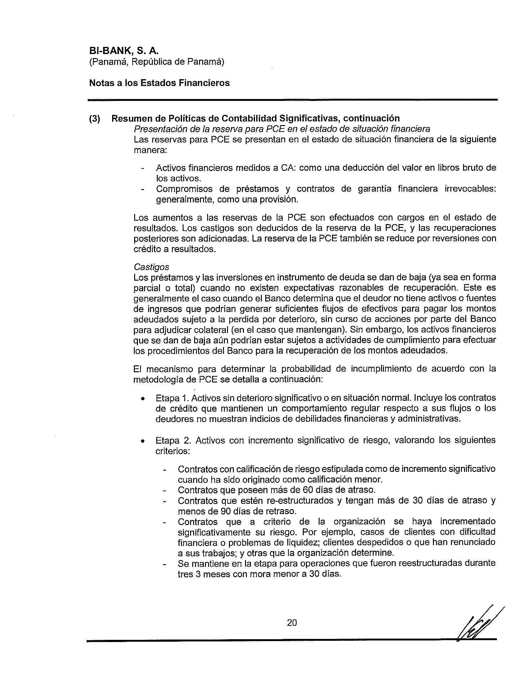 El Banco determina el castigo de un grupo de préstamos que presenta incobrabilidad. Esta determinación se toma después de efectuar un análisis de las condiciones financieras hechas desde el último pago de la obligación, y cuando se determina que la garantía no es suficiente para el pago completo de la facilidad otorgada. Para los préstamos de montos menores, los castigos generalmente se basan en el tiempo vencido del crédito otorgado.