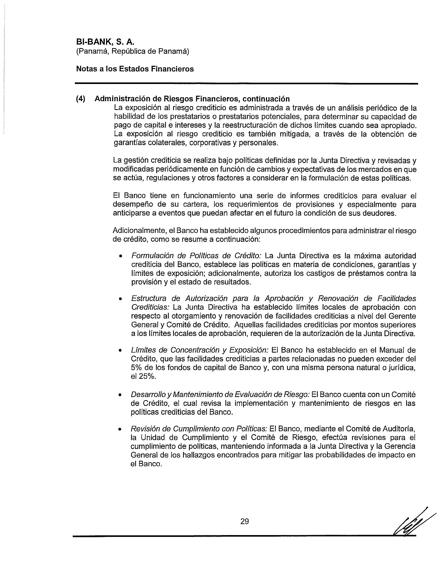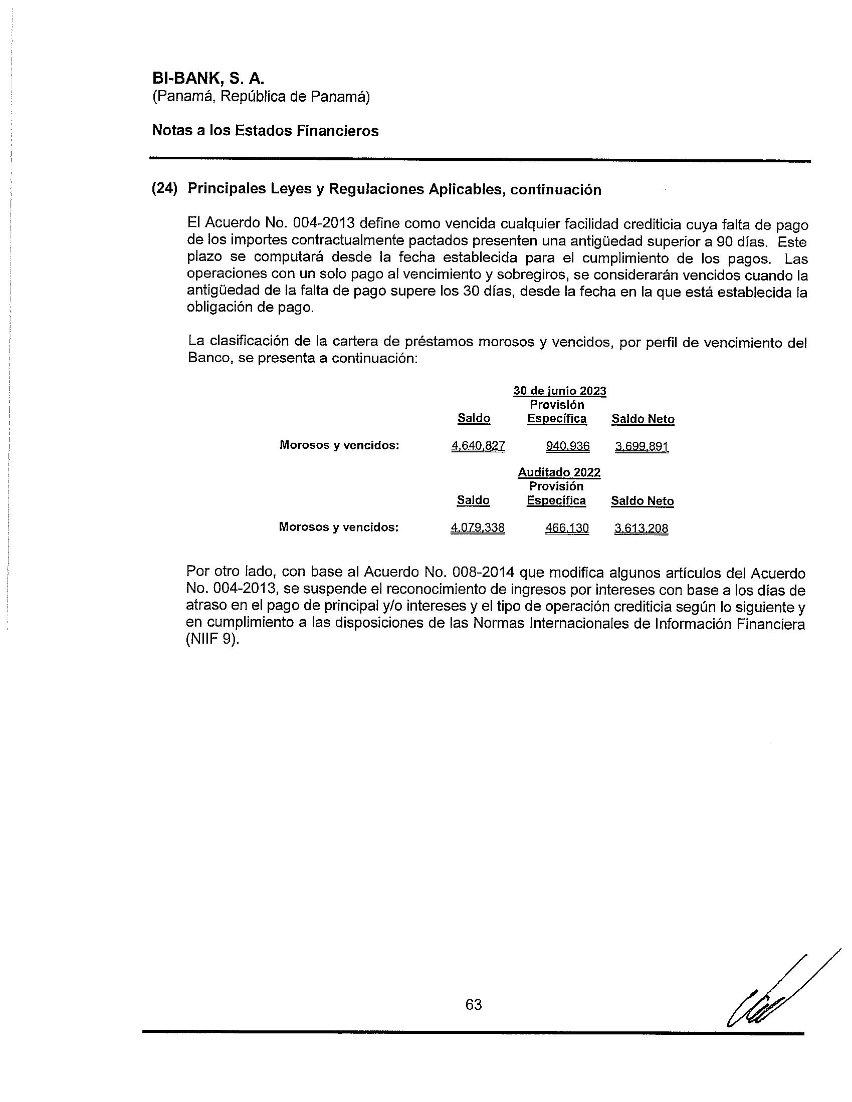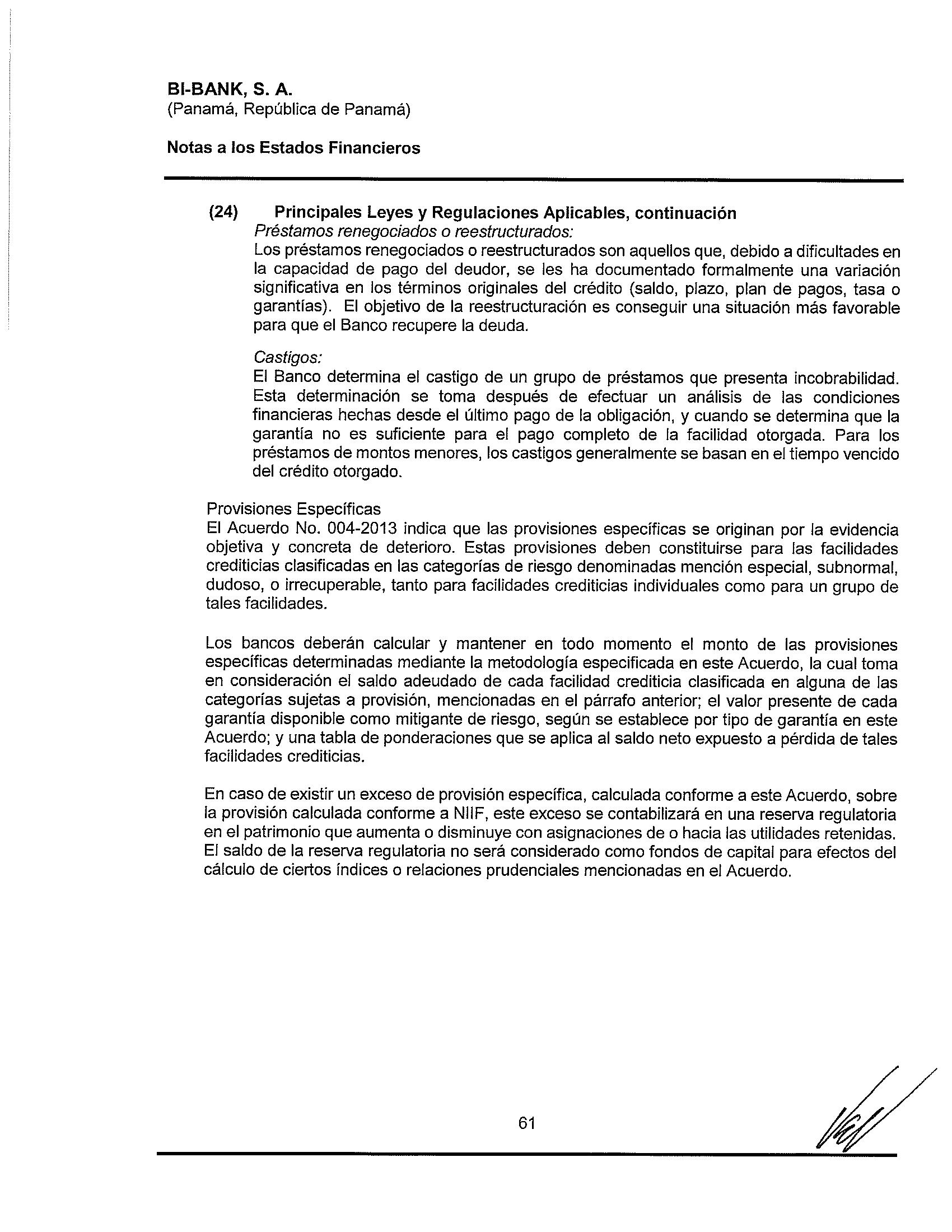 (a) Acuerdo No. 004 - 2013 Disposiciones sobre la Gestión y Administración del Riesgo de Crédito Inherente a la Cadera de Préstamos y Operaciones Fuera del Estado de Situación Financiera, emitidoporla Superintendencia de Bancos de Panamá el 28 de mayo de 2013.
