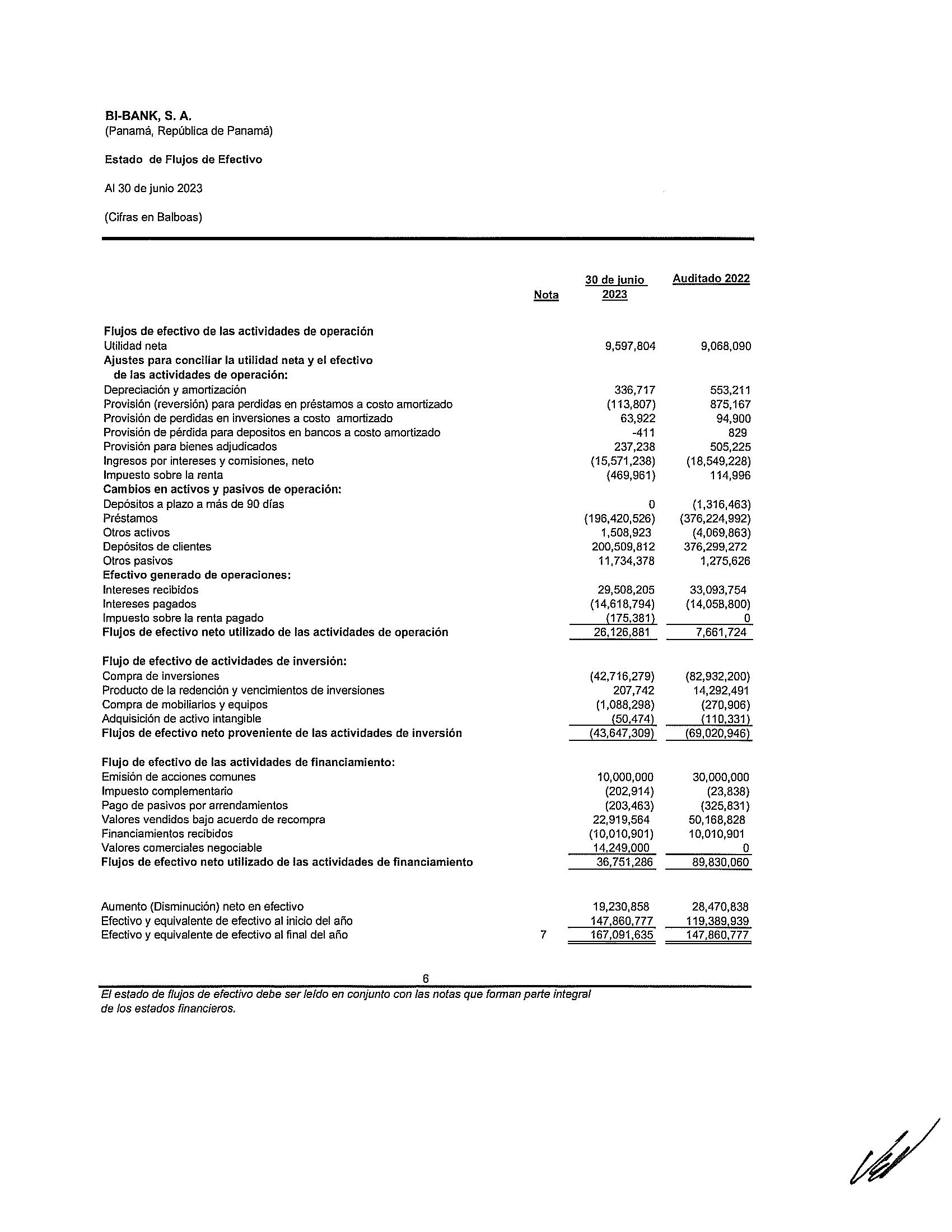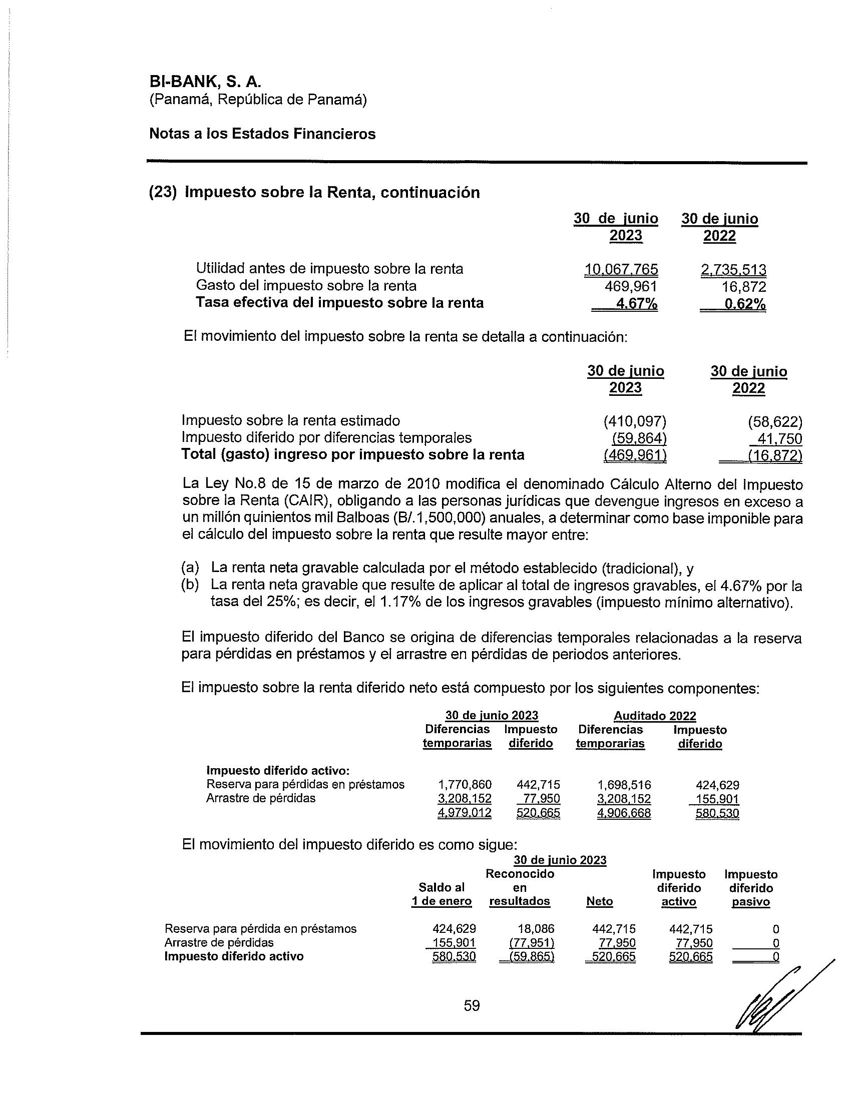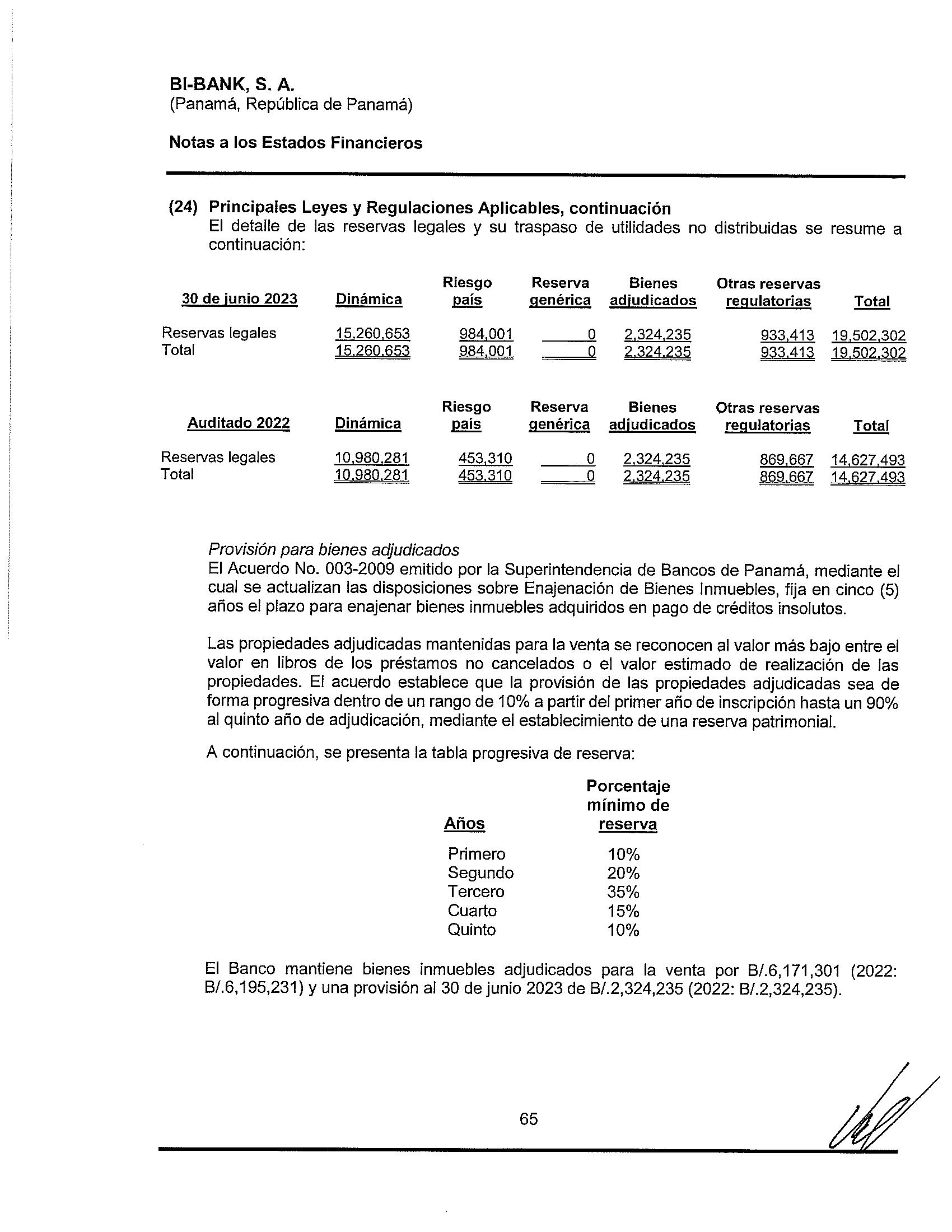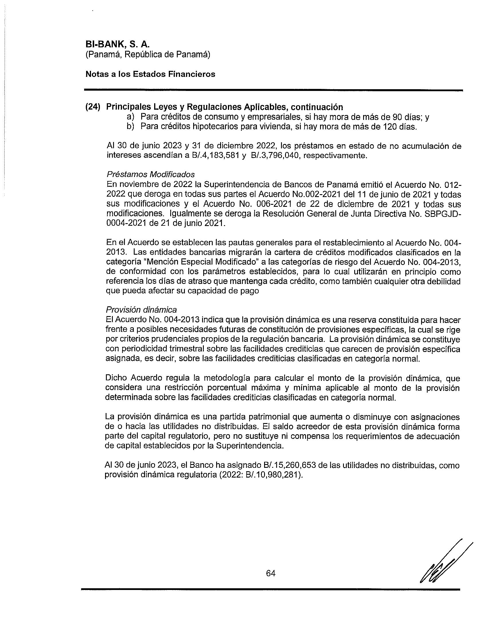 Al 30 de junio 2023, el Banco ha asignado B/.15,260,653 de las utilidades no distribuidas, como provisión dinámica regulatoria (2022: B/.10,980,281).
