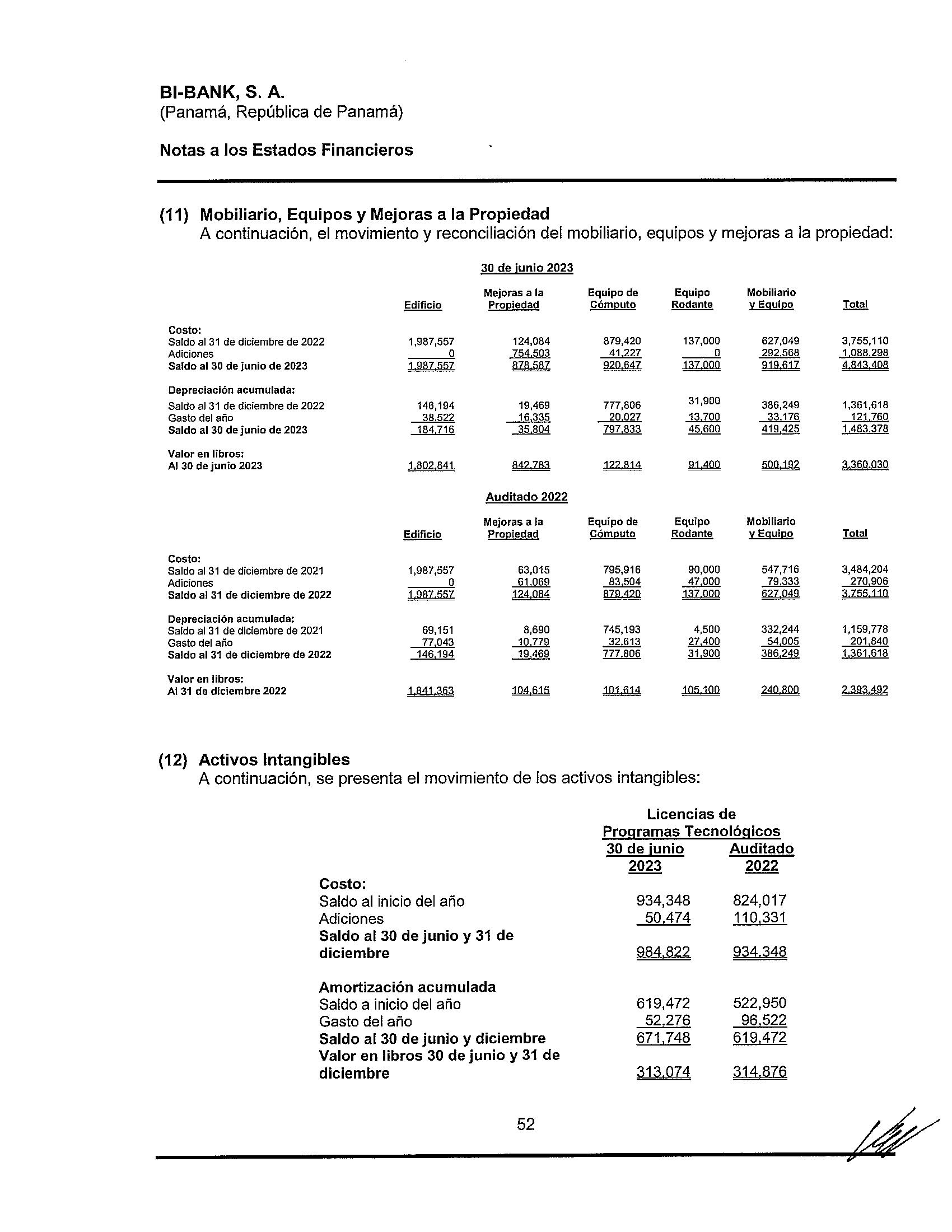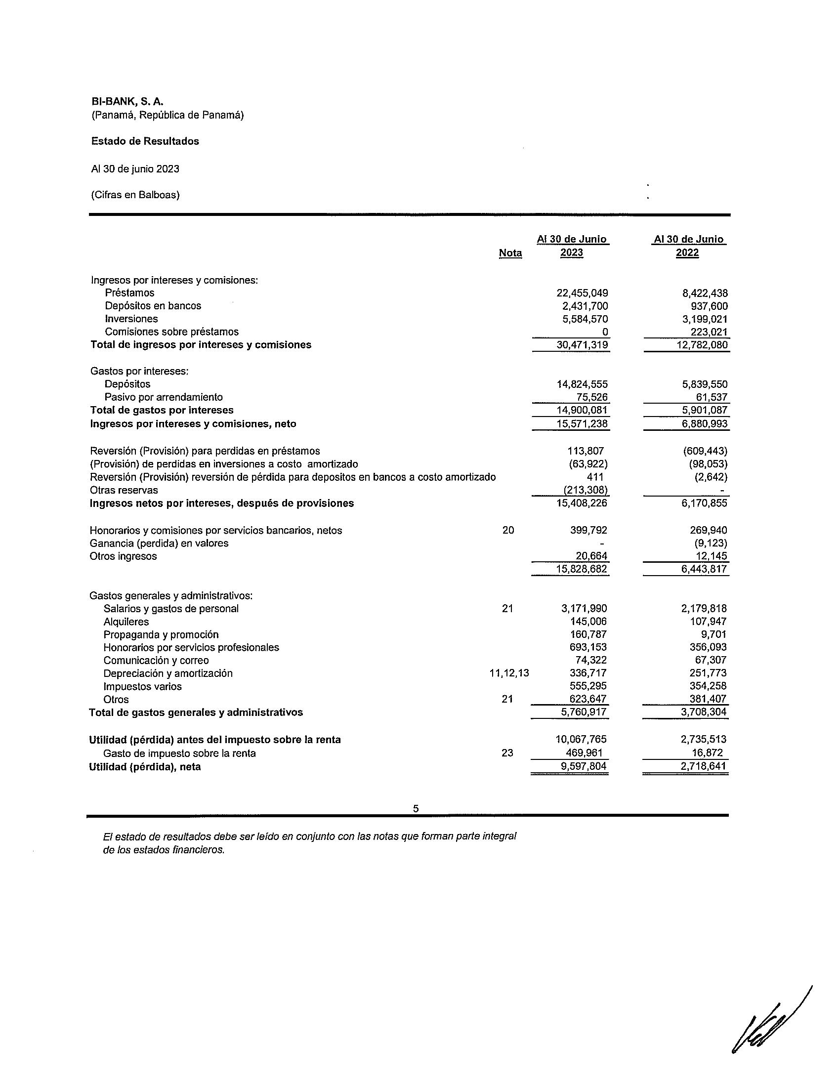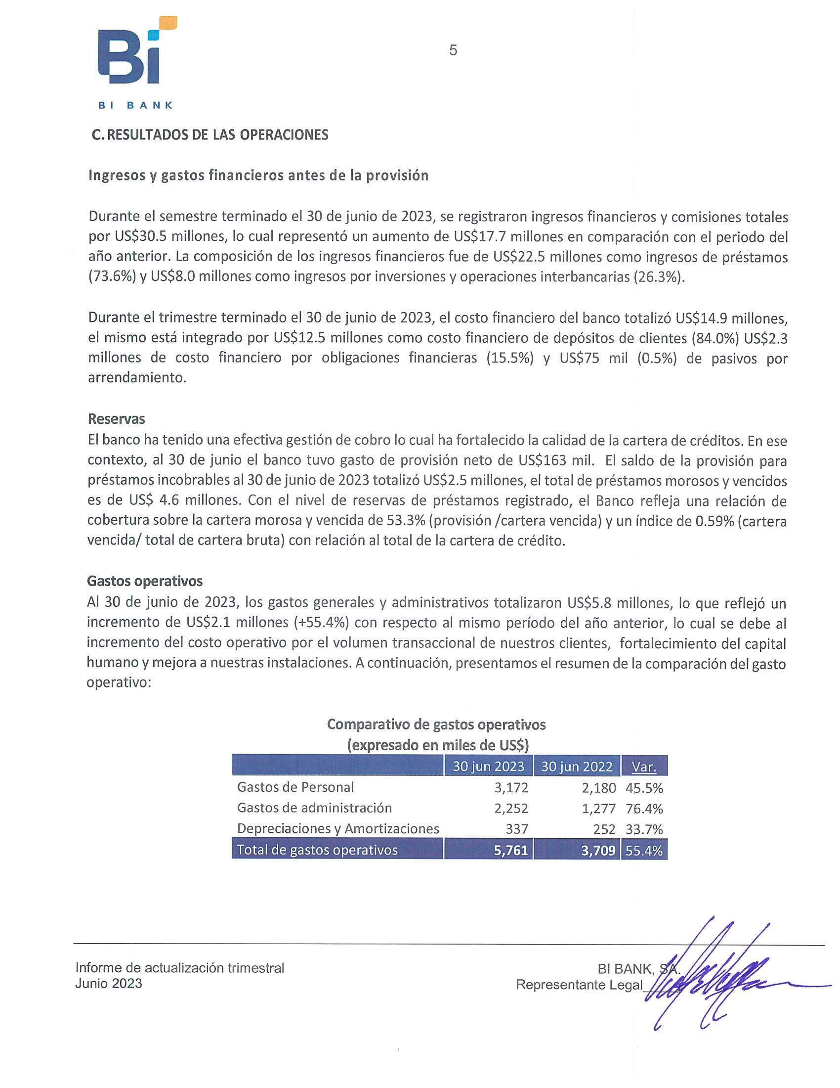 operativo: Comparativo de gastos operativos (expresado en miles de US$) 30jun 2023 30jun 2022 Var. Gastos de Personal 3,172 2,180 45.5% Gastos de administración 2,252 1,277 76.4% DepreciacionesyAmortizaciones 337 252 33.7% a e gastos operativos 5,761 3,709 55.4% / Informe de actualización trimestral BI BANK, ,/‘ // Junio 2023 Representante Legal