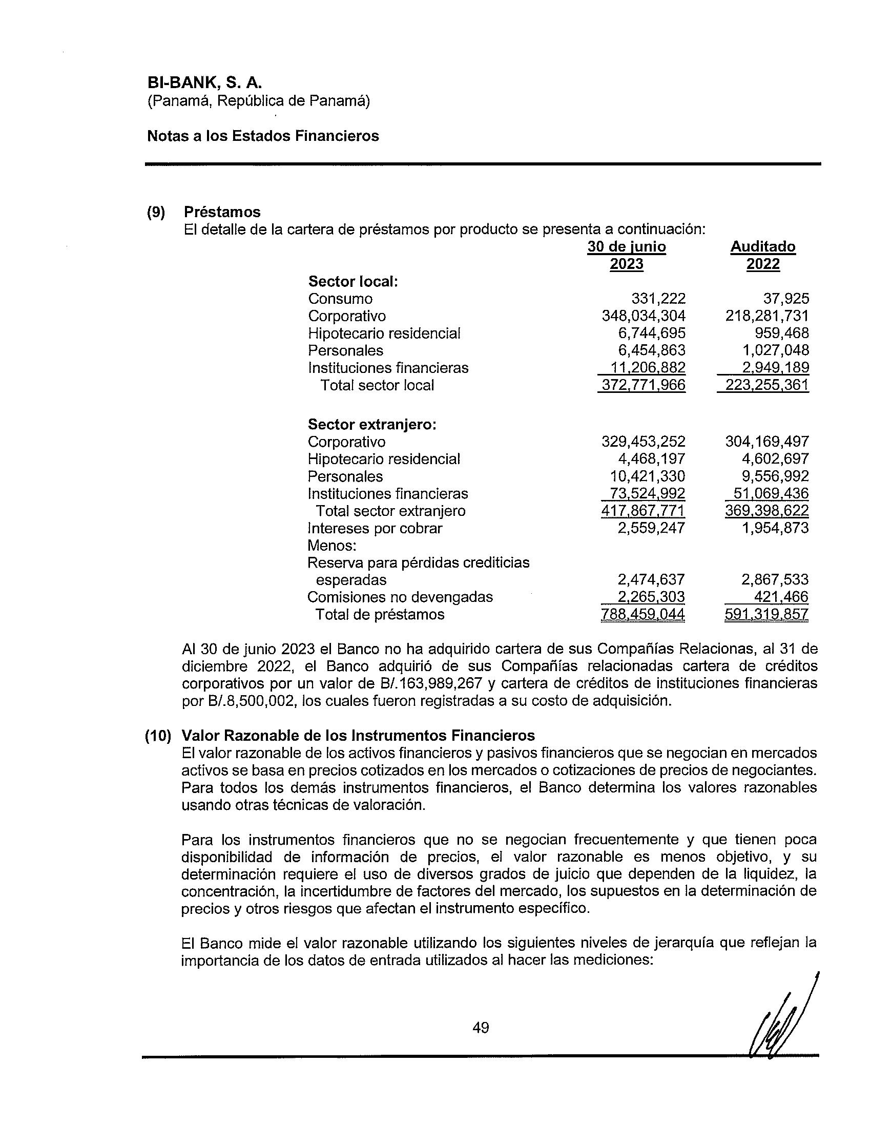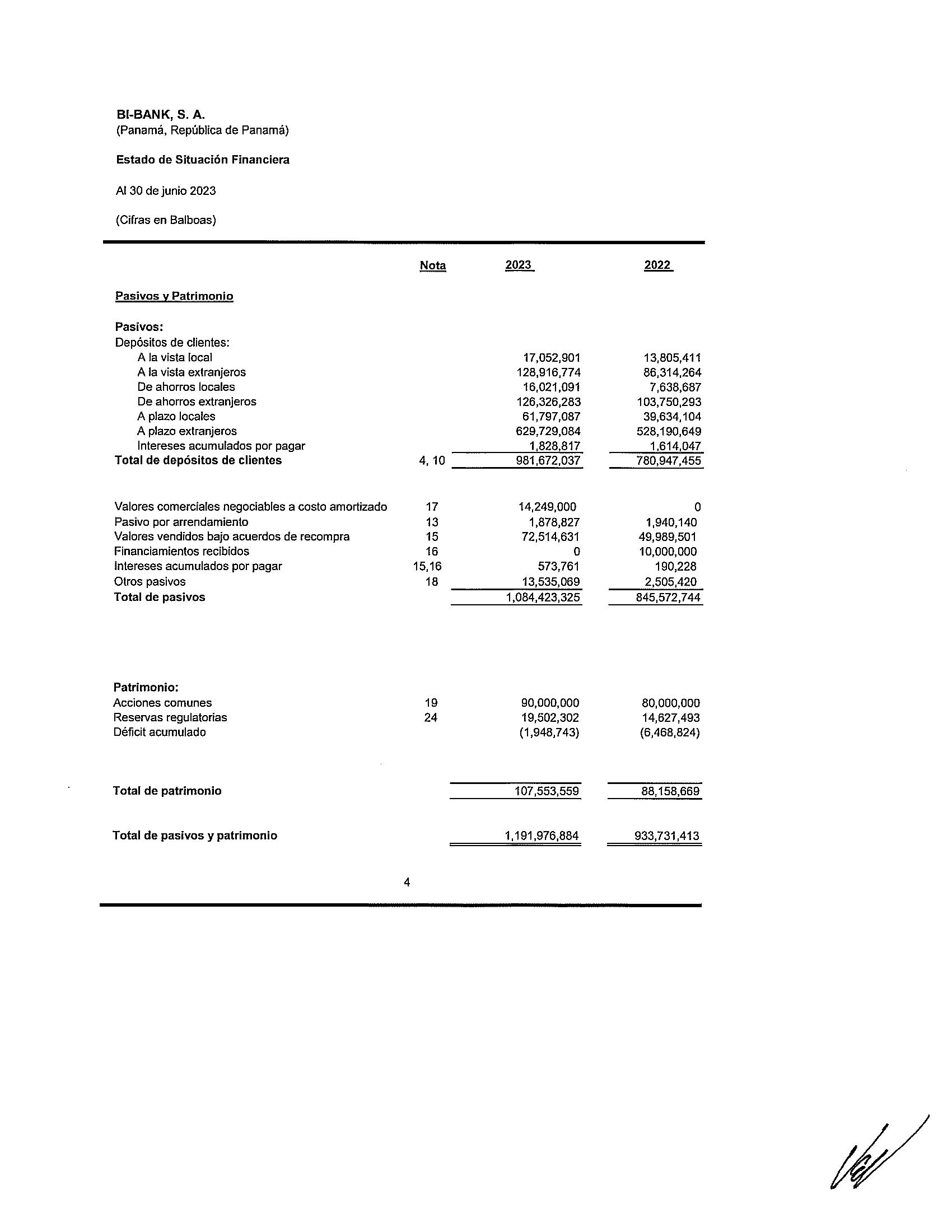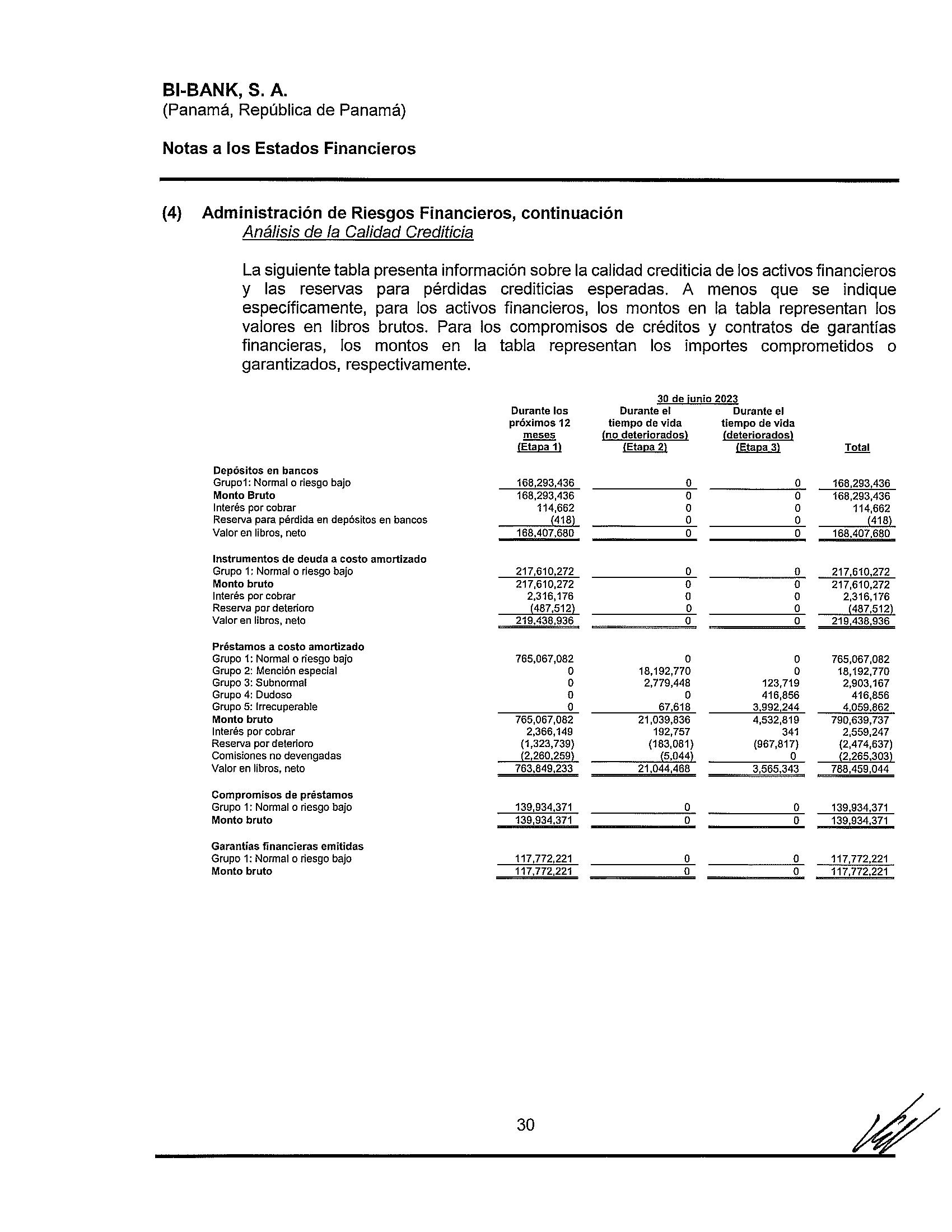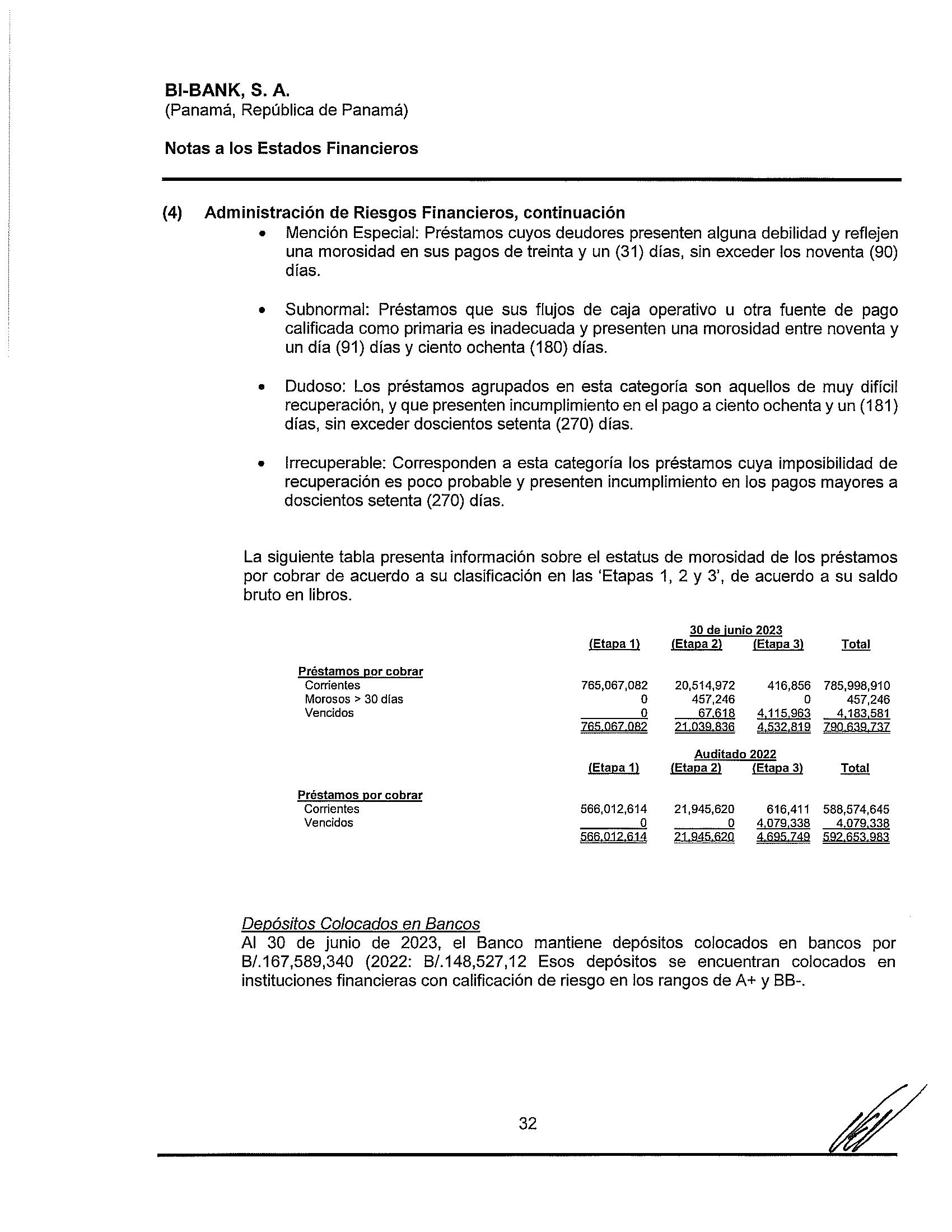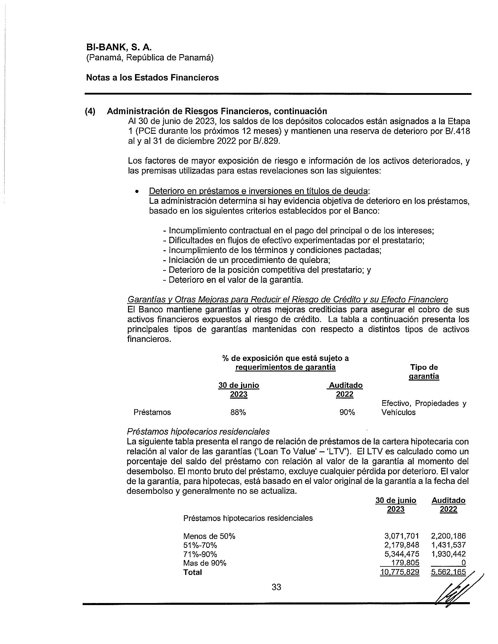 Al 30 de junio 2023 y 31 de diciembre 2022, los préstamos en estado de no acumulación de intereses ascendían a BI.4,183,581 y BI.3,796,040, respectivamente.