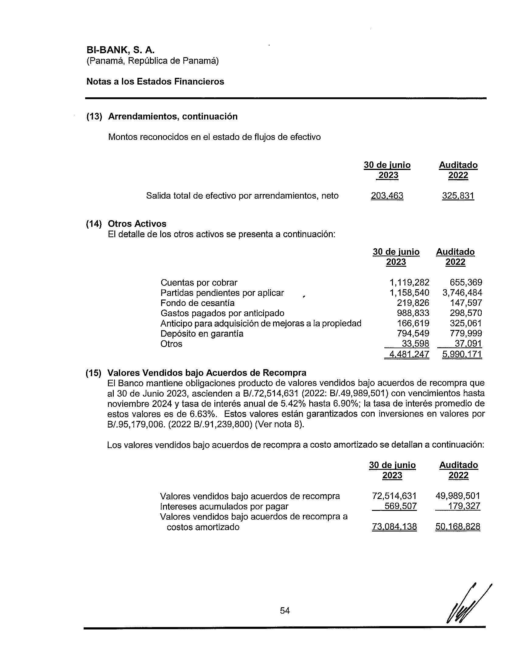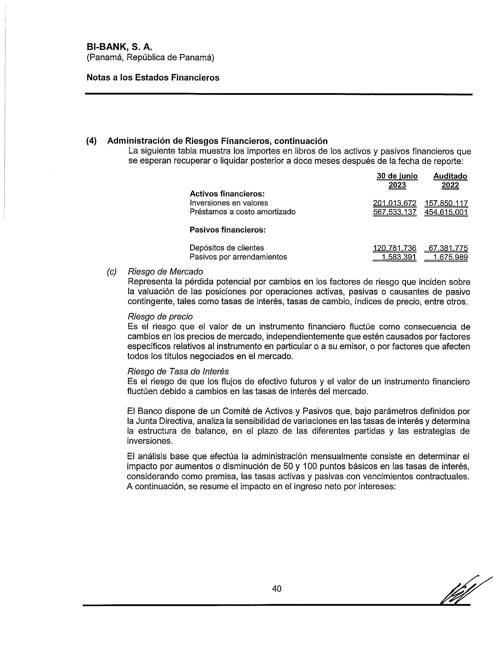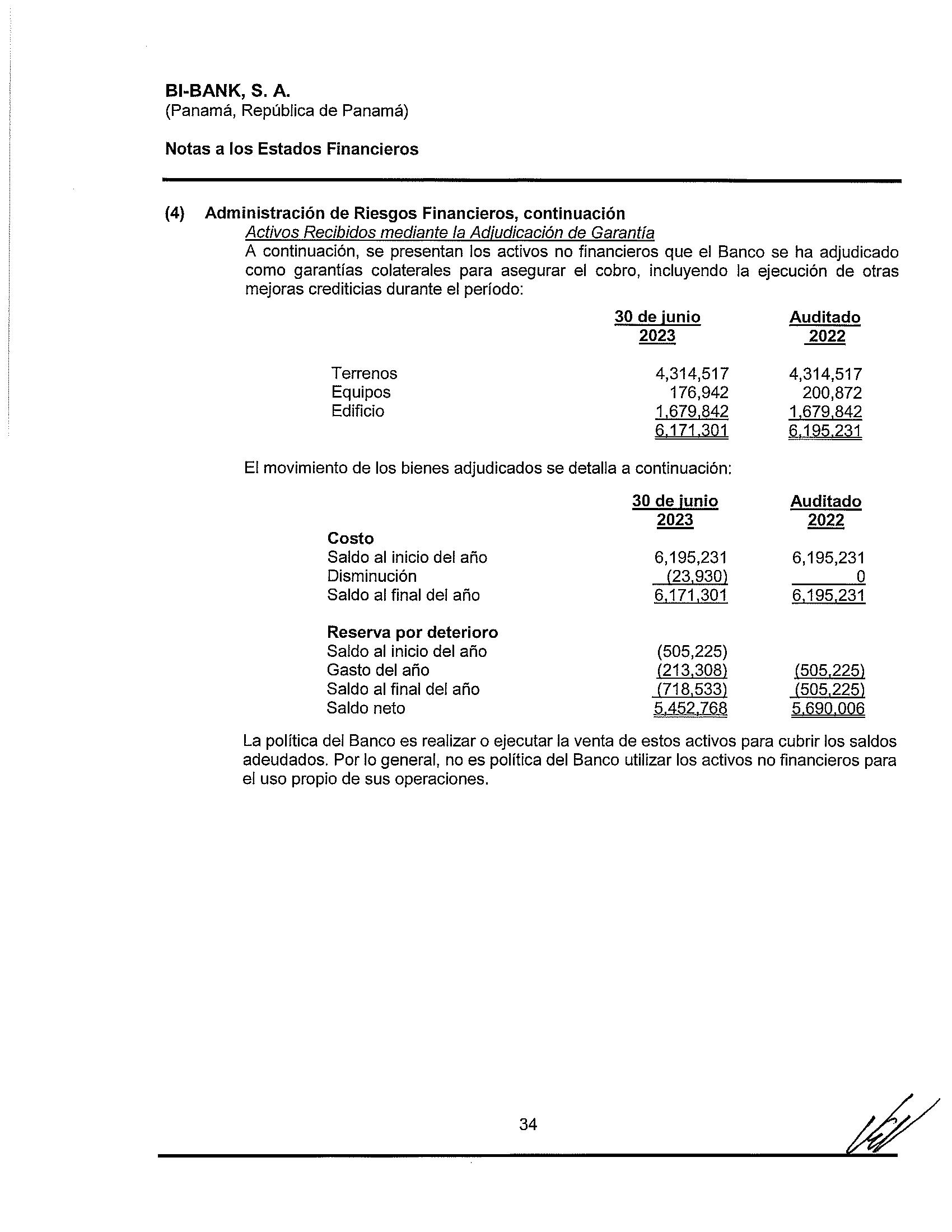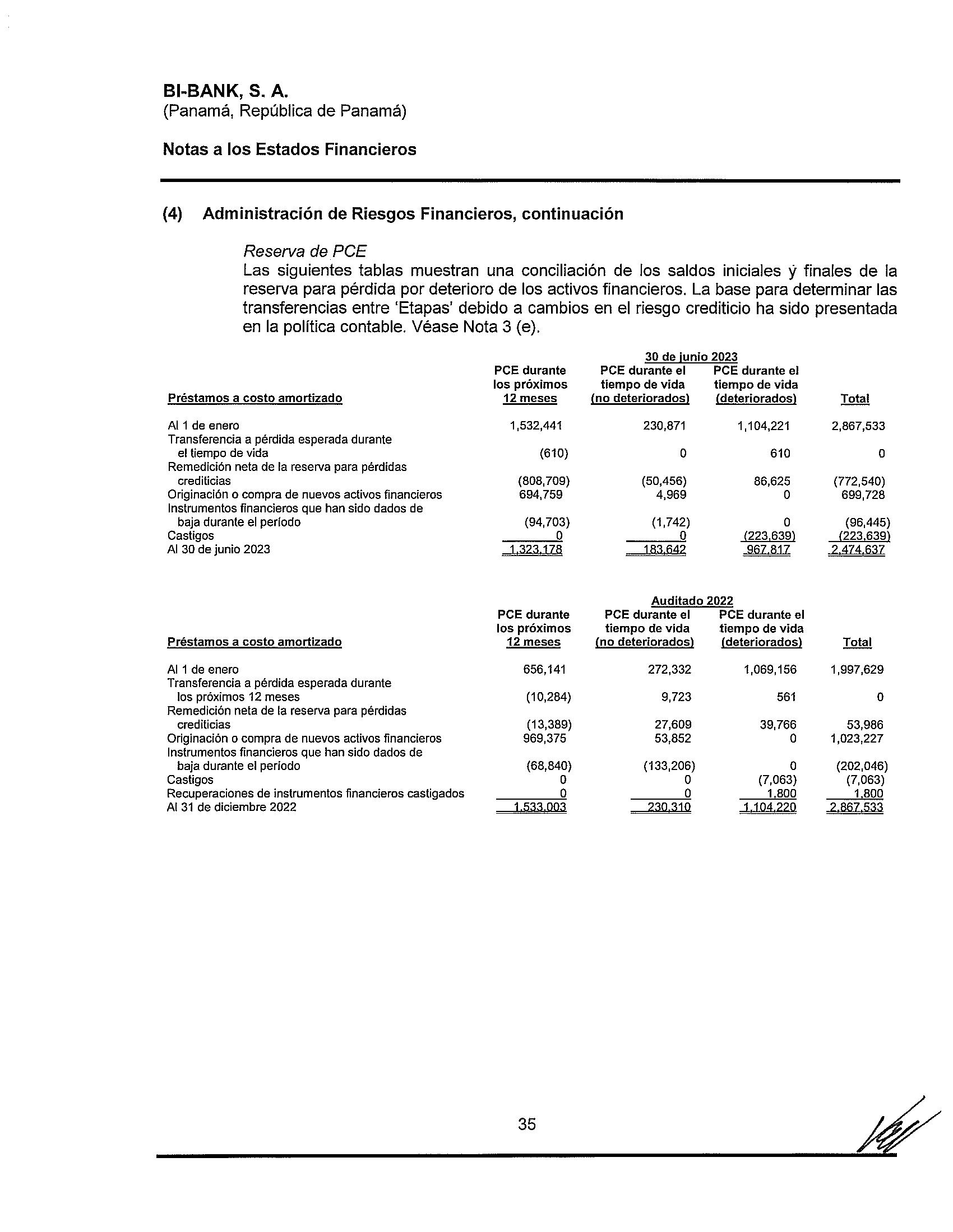 Al 30 de junio 2023 y 31 de diciembre 2022, los préstamos en estado de no acumulación de intereses ascendían a BI.4,183,581 y BI.3,796,040, respectivamente.