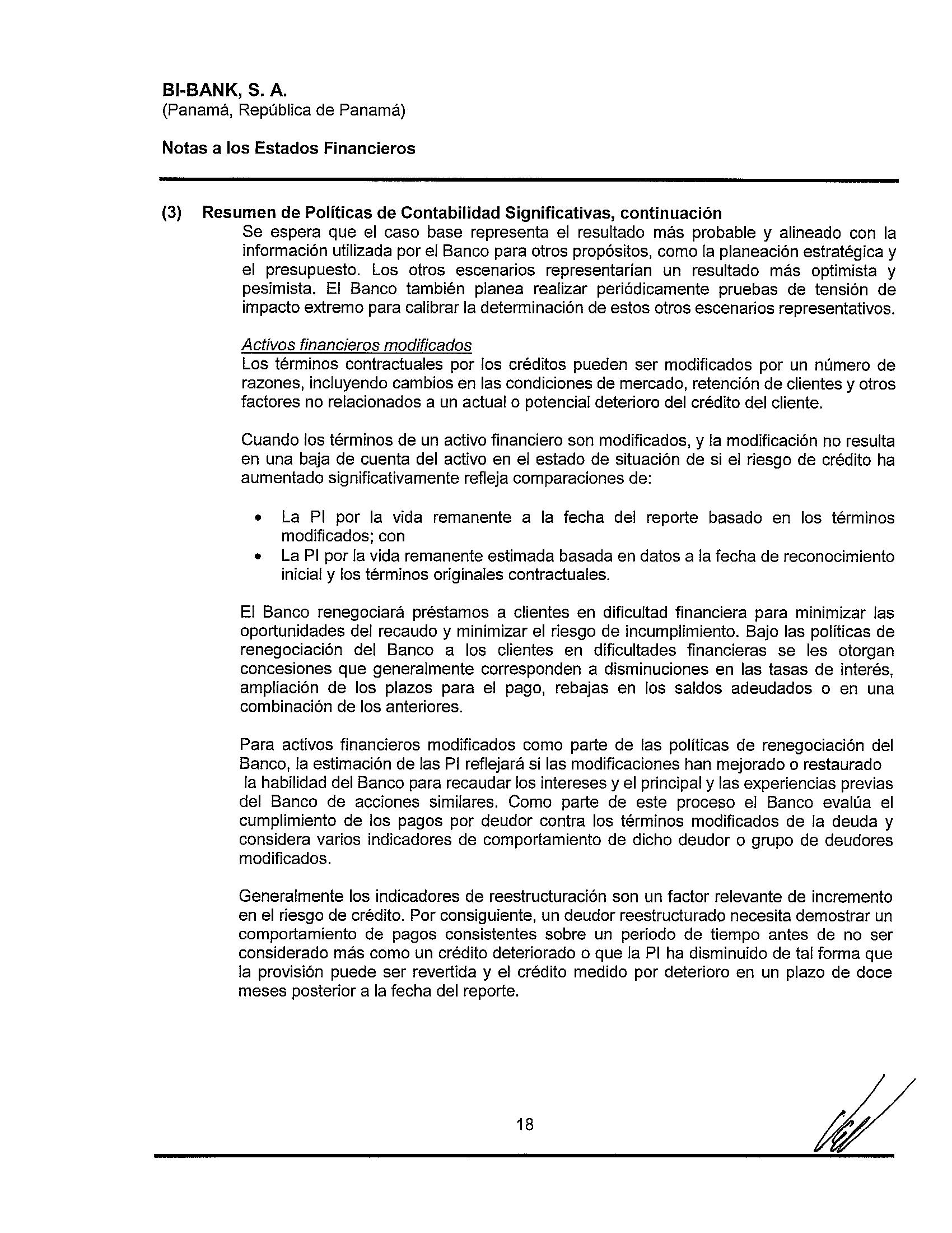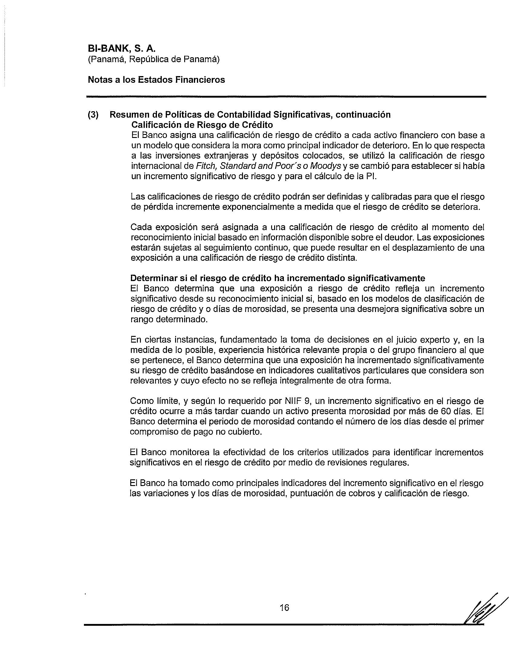 Por otro lado, con base al Acuerdo No. 008-2014 que modifica algunos artículos del Acuerdo No. 004-2013, se suspende el reconocimiento de ingresos por intereses con base a los días de atraso en el pago de principal y/o intereses y el tipo de operación crediticia según lo siguiente y en cumplimiento a las disposiciones de las Normas Internacionales de Información Financiera (NIIF 9).