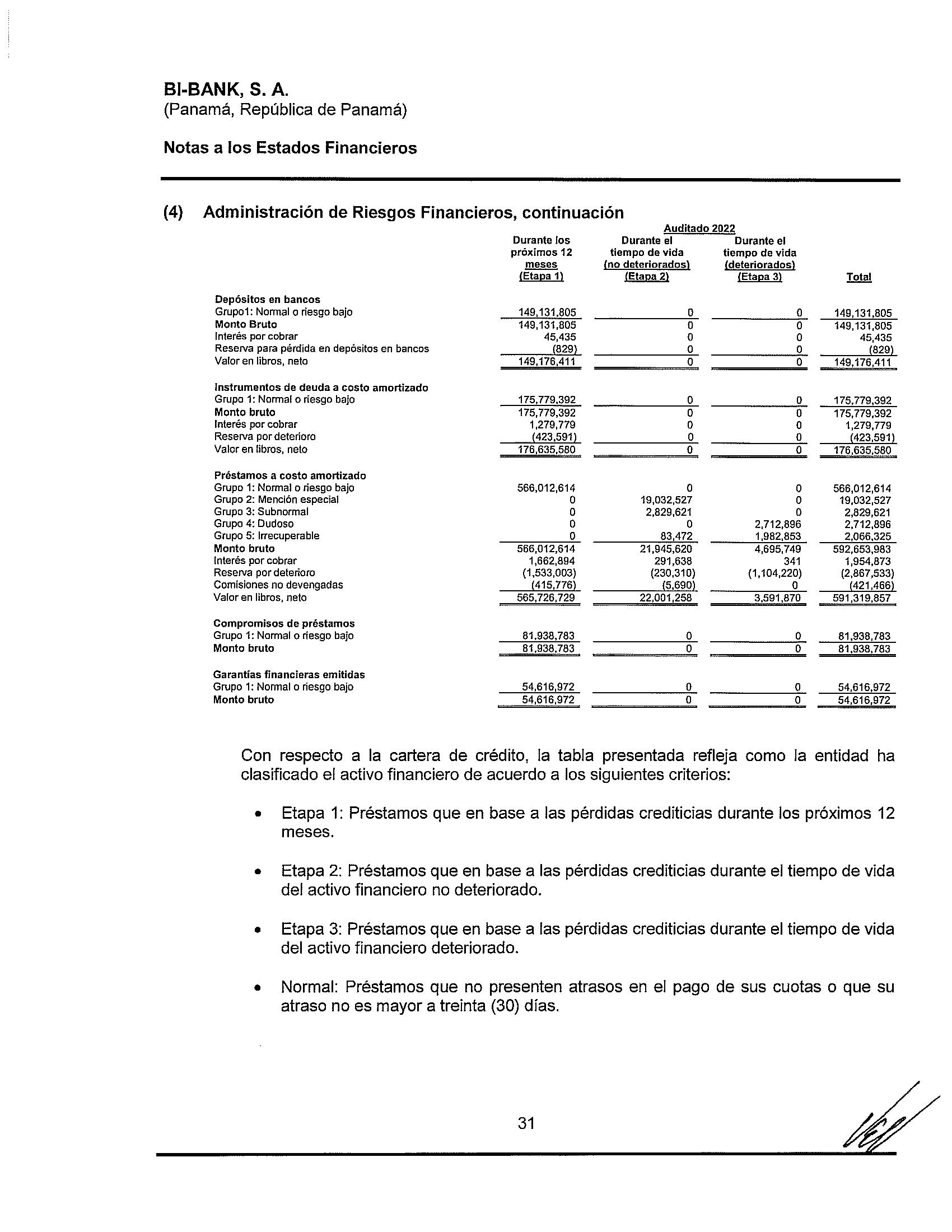 El cuadro a continuación resume la clasificación de la cartera de préstamos dei Banco con base en el Acuerdo No. 002-2021 y No. 004-2013 al 31 de diciembre 2022 y 31 de diciembre 2021.