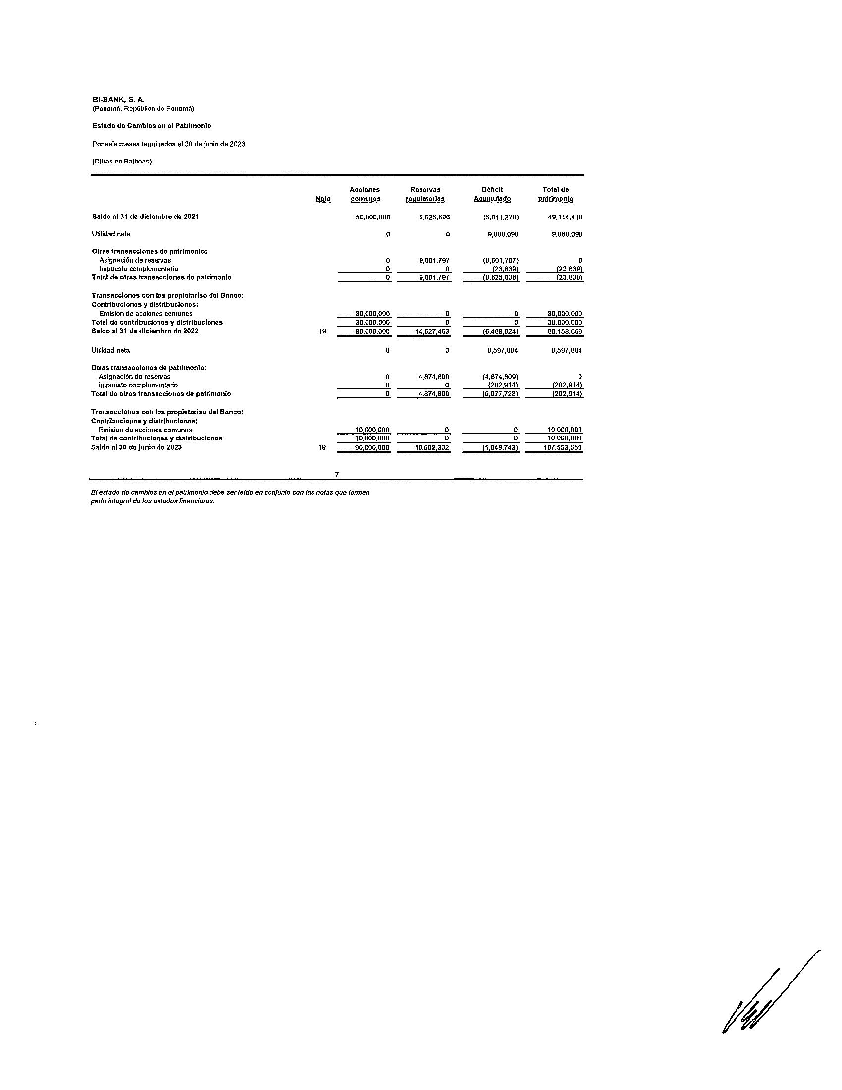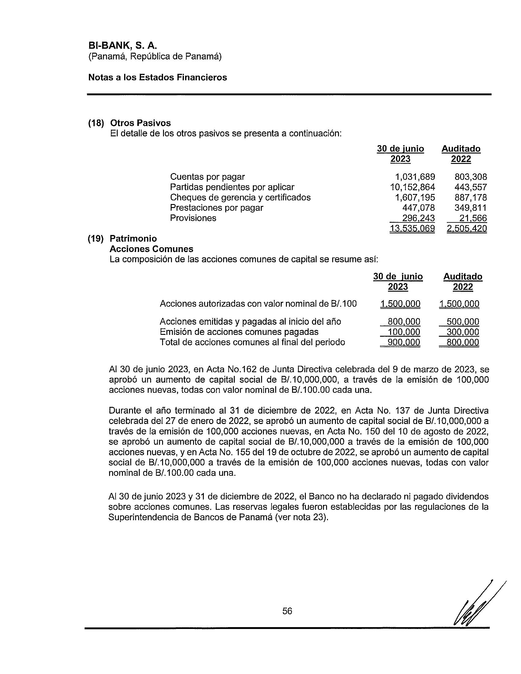 Al 30 de junio 2023, en Acta No.162 de Junta Directiva celebrada del 9 de marzo de 2023, se aprobó un aumento de capital social de 81.10,000,000, a través de la emisión de 100,000 acciones nuevas, todas con valor nominal de BI.100.00 cada una.