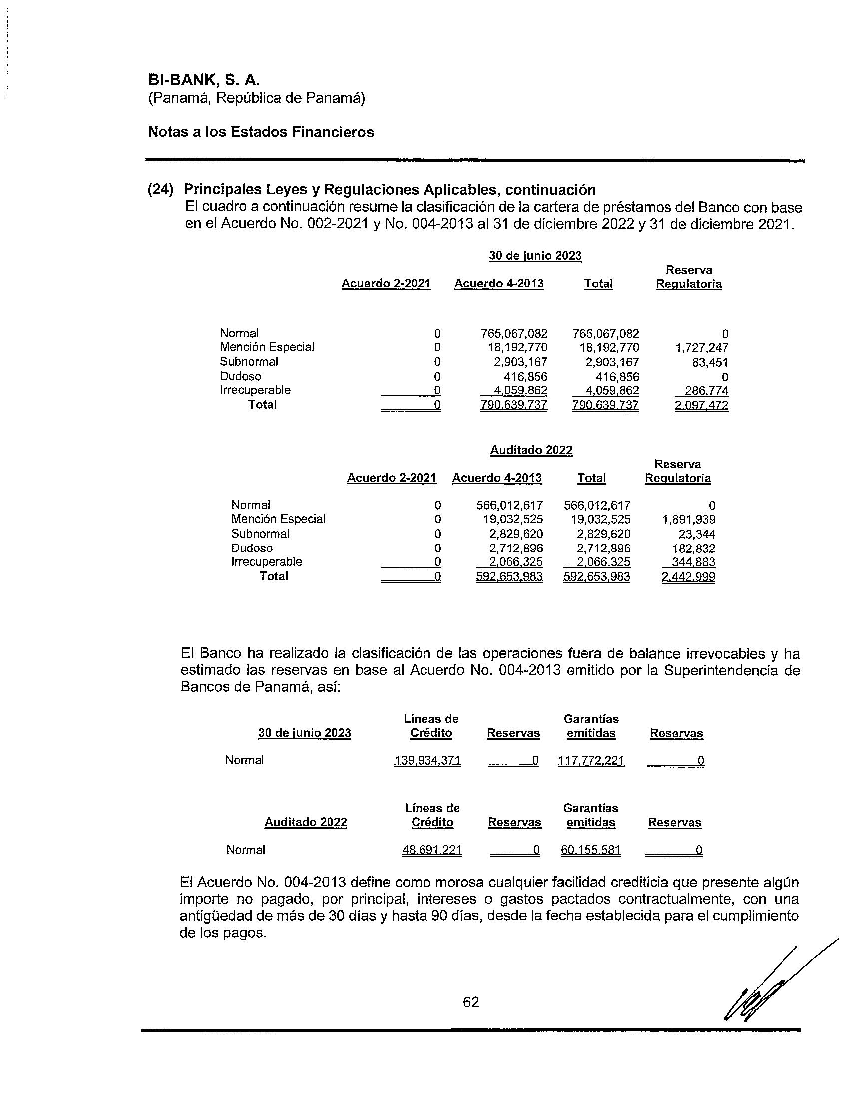 de iunio 2023 Reserva Acuerdo 2-2021 Acuerdo 4-2013 Total Regulatoria Normal 0 765067082 765,067,082 0 Mención Especial 0 18,192,770 18,192,770 1,727,247 Subnormal 0 2,903,167 2,903,167 83,451 Dudoso 0 416,856 416,856 0 Irrecuperable 0 4,059,862 4.059.862 286,774 Total 1911.fi39J3Z Z~f~2~ 2097472 Auditado 2022 Reserva Acuerdo 2-2021 Acuerdo 4-2013 Total Regulatoria Normal 0 566,012,617 566,012,617 0 Mención Especial 0 19,032,525 19,032,525 1,891,939 Subnormal 0 2,829,620 2,829,620 23,344 Dudoso 0 2,712,896 2,712,896 182,832 Irrecuperable 0 2,066,325 2,066,325 344,883 Total O 5~2.fi5j9B3 5a2J53.9B3 2.442 999