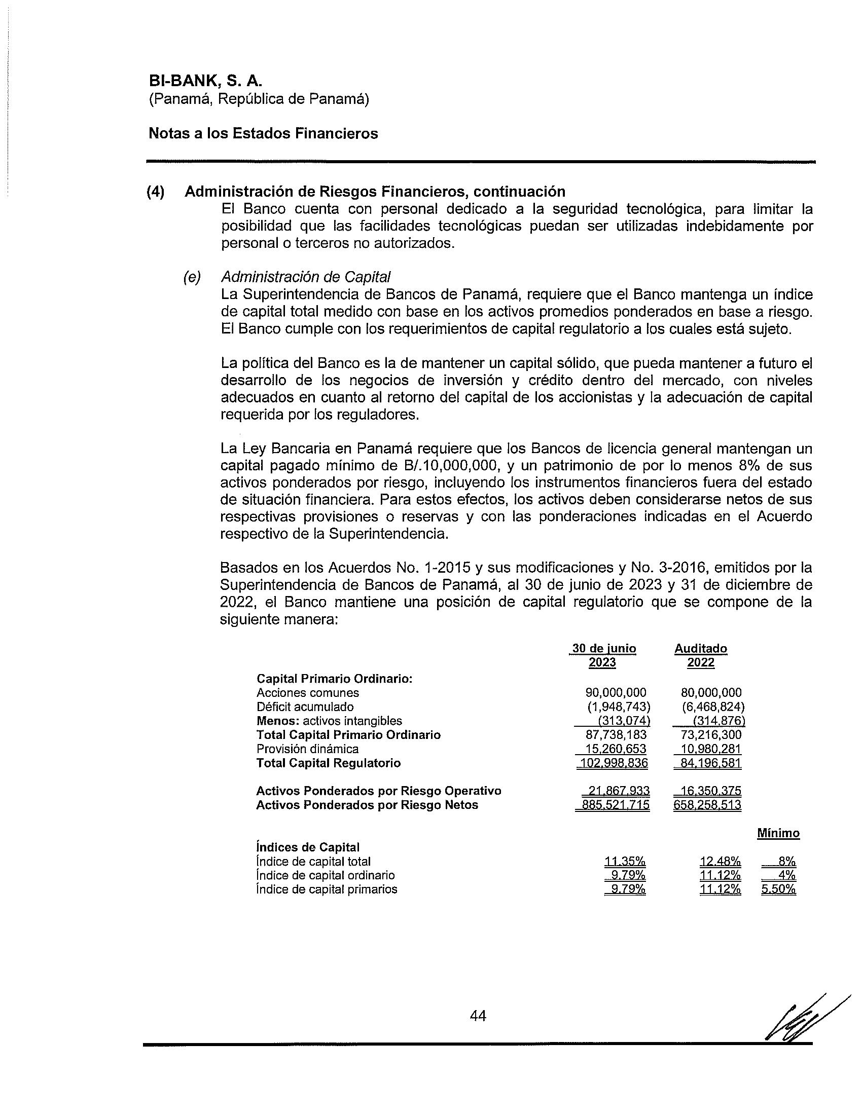 El Banco analiza su capital regulatorio aplicando las normas de la Superintendencia de Bancos establecidas para los bancos de Licencia General, basado en los Acuerdos 1-2015 del 3 de febrero de 2015 y 3-2017 del 22 de marzo de 2017. Al 30 de junio de 2023, el Banco presenta un índice de adecuación de capital de 11.35% (diciembre de 2022: 12.48%) sobre sus activos ponderados en base a riesgos, este indicador se encuentra por encima del 8% exigido por el ente regulador. La adecuación de capital es monitoreada por la Administración del Banco basado en normas desarrolladas por la Superintendencia de Bancos.