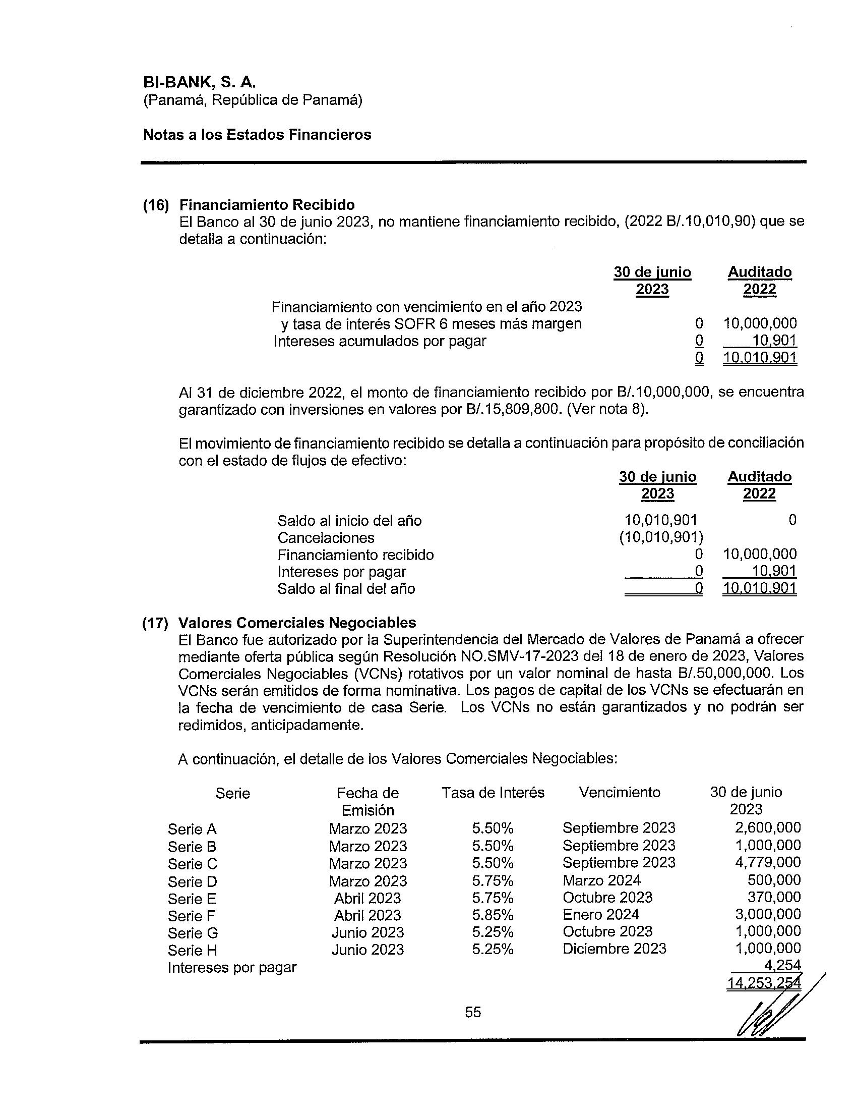 El Banco fue autorizado por la superintendencia del Mercado de Valores de Panamá a ofrecer mediante oferta pública según Resolución NO.SMV-17-2023 del 18 de enero de 2023, Valores Comerciales Negociables (VCN5) rotativos por un valor nominal de hasta Us$50,000,000. Los VCNs serán emitidos de forma nominativa. Los pagos de capital de los VCNs se efectuarán en la fecha de vencimiento de casa Serie. Los VCNs no están garantizados y no podrán ser redimidos, anticipadamente. A continuación, se presente el detalle de los Valores Comerciales Negociables: