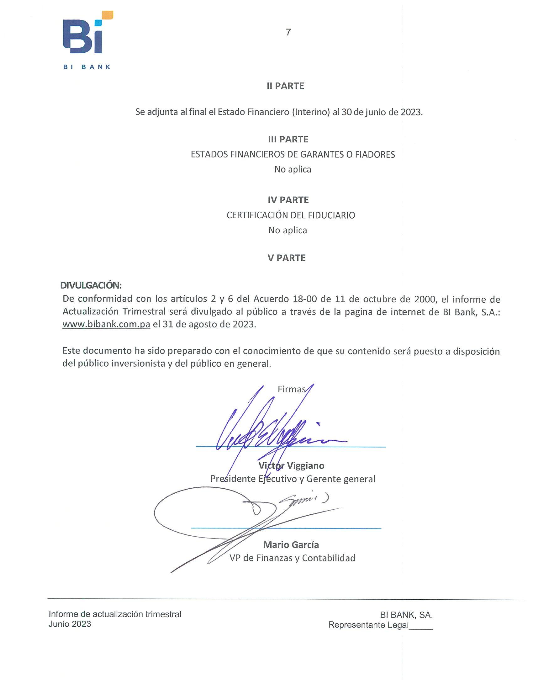 De conformidad con los artículos 2 y 6 del Acuerdo 18-00 de 11 de octubre de 2000, el informe de Actualización Trimestral será divulgado al público a través de la pagina de internet de BI Bank, S.A.: www.bibank.com.pa el 31 de agosto de 2023.