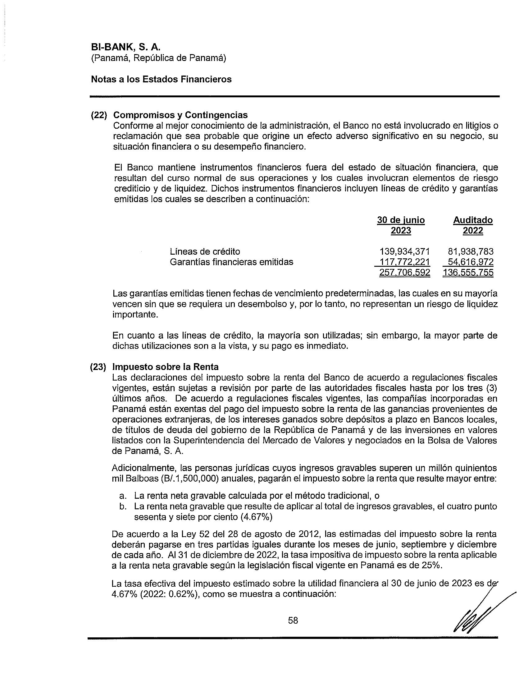 30 de iunio Auditado 2023 2022 Lineas de crédito 139,934,371 81,938783 Garantías financieras emitidas 117,772,221 54,616,972 257.706.592 136.555.755
