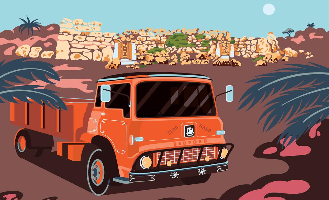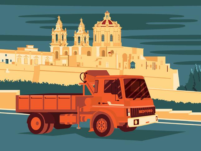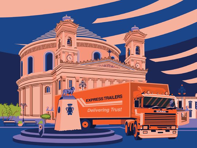 Express Trailers’ eclectic fleet of orange trucks and trailers have been reimagined in a series of thirteen illustrations which portray the orange vehicles owned by the logistics company over the years, set amongst some of the most recognisable landmarks around Malta and Gozo.