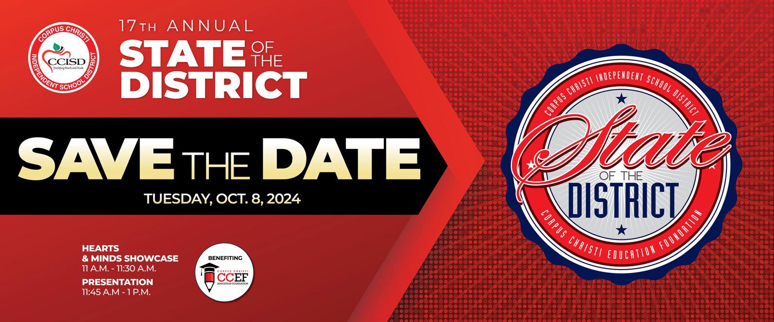 Mark your calendars! The Corpus Christi Education Foundation is hosting the 17th Annual State of the District event on Tuesday, Oct. 8. Proceeds support the efforts of the foundation, including annual “Grants for World-Class Schools” which funded new programming in more than 100 CCISD classrooms last year. For sponsorship and ticket information, please call 695-7412 or visit the Corpus Christi Education Foundation Website.