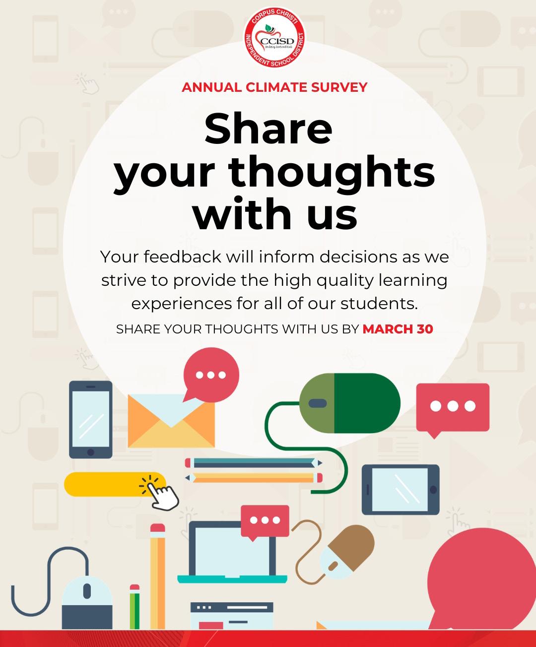 Our annual climate survey runs through 4:30 p.m., Monday, March 30. This is our annual opportunity to get feedback from staff, families and the community so we may continue to improve the Corpus Christi ISD experience. Please complete the survey using the Corpus Christi ISD Climate Survey link. If you prefer, you may also access the survey from the homepage at ccisd.us. Thank you for taking the time to share your thoughts!