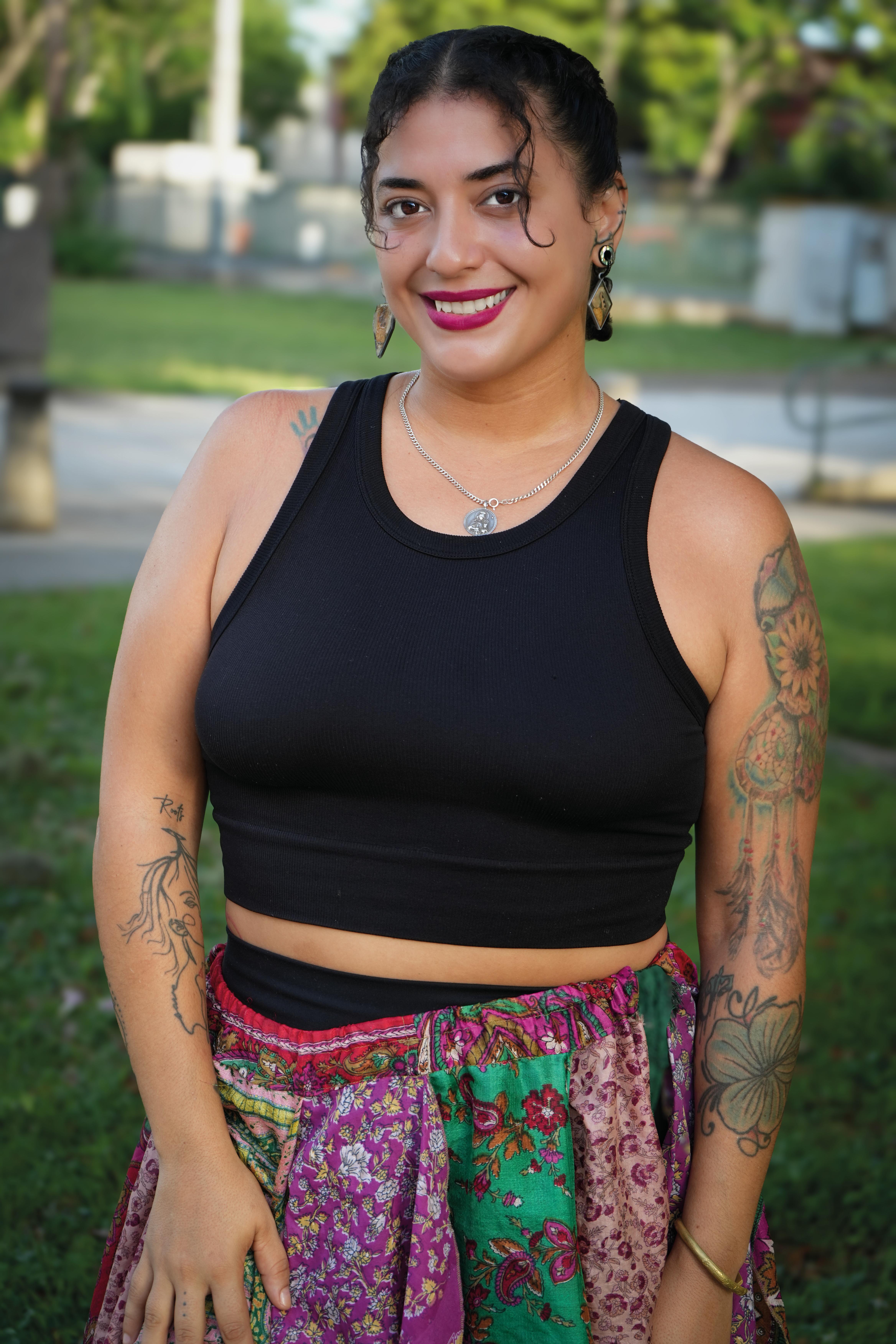 Shirley Marie Rodríguez. Tiene treinta y seis años y estudia Arte en Drama en la Universidad de Puerto Rico, Recinto de Río Piedras. Es un bosque brillante —peregrina de su propio camino espiritual. Desde ahí nace su danza, sus movimientos y arte y naturaleza. Teatrera in the making. Aprendiz por la vida. Mucha sandunga también. Pronombres: Ella, Elle