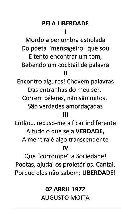 O soneto pretensamente “revolucionário” em caixa, escrito há mais de 51 anos, contém dois pressupostos que, penso, serviram para alavancar a revolução pacífica (dos cravos) perpetrada pelo MFA (Capitães de Abril) que depôs o regime fascista do Estado Novo em 25 de abril de 1974: a VERDADE que nunca foi revelada sobre as motivações que conduziram à intervenção militar em defesa das ex-colónias, em uma guerra colonial (parafraseando Salazar: “rapidamente e em força”), de várias frentes, declaradamente injusta, que dizimou e estropiou milhares de jovens (+8000) e que constituiu o leitmotiv para a ação do MFA - pôr fim à guerra -, sem nunca ter aventado a possibilidade de uma descolonização negociada que tivesse protegido os legítimos interesses de Portugal e dos portugueses residentes; a existência de uma reserva de ouro (8ª. reserva no mundo em 1974) cuja proveniência, alegadamente da venda de volfrâmio aos nazis, durante o período da 2ª. Guerra Mundial (1939 a 1945) que naturalmente serviu de algum suporte financeiro à manutenção da guerra, reprovada internacionalmente, com a consequente ostracização do país e que levou Salazar a proferir a célebre frase: “orgulhosamente sós” conduzindo-o ao isolacionismo e ao consequente atraso civilizacional de décadas, ainda hoje notório na sociedade portuguesa; e a LIBERDADE para o povo usufruir de uma vida digna (pobreza extrema e iliteracia), e de poder expressar livremente as suas opiniões e ter opções políticas (propaganda e repressão), entre outras liberdades. Pressupostos que, só através da implementação de um regime democrático, tornaria possível e de que o MFA foi o pilar fundamental ao derrubar a ditadura em consonância e com o apoio da sociedade civil. Seguiram-se tempos difíceis para a novel democracia portuguesa em um período que ficou conhecido como PREC (11/03 a 25/11/1975) que culminou com uma intentona para impor um regime comunista (pró-soviético), abortada pela coragem e determinação do General Ramalho Eanes. Seguiram-se as primeiras eleições livres em 25 de abril de 1976 que legitimaram a democracia.