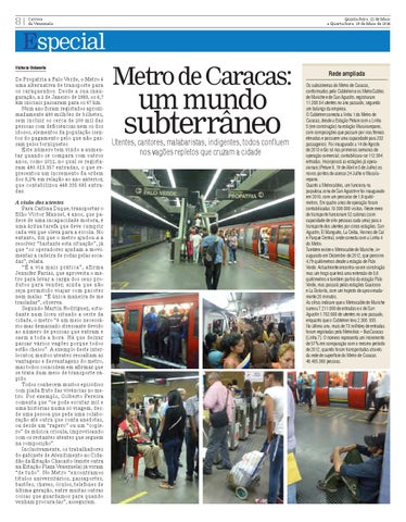 De Propatria a Palo Verde, o Metro é uma alternativa de transporte para os caraquenhos. Desde a sua inauguração, a 2 de Janeiro de 1983, os 6,7 km iniciais passaram para os 67 km. Num ano foram registados aproximadamente 490 milhões de bilhetes, sem incluir os cerca de 200 mil das pessoas com deficiências nem os dos idosos, elementos da população isentos do pagamento pelo que não passam pelos torniquetes. Este número tem vindo a aumentar quando se compara com outros anos, como 2012, no qual se registaram 490.013.357 entradas, o que representou um incremento da ordem dos 9,2% em relação ao ano anterior, que contabilizou 448.335.695 entradas. A visão dos utentes Para Carlina Duque, transportar o filho Víctor Manuel, 4 anos, que padece de uma incapacidade motora, é uma árdua tarefa que deve cumprir cada vez que oleva para a escola. No entanto, diz que o metro ajudou-a a resolver “bastante esta situação”, já que “os operadores ajudam a movimentar a cadeira de rodas pelas escadas”, relata. “É a via mais prática”, afir ma Jennifer Farías, que aproveita o metro para levar a carga dos seus produtos para vender, ainda que não seja permitido viajar com pacotes nem malas. “É única maneira de me trasladar”, observa. Segundo Martin Rodríguez, estudante num liceu situado a oeste da cidade, o metro “é um meio necessário mas demasiado stressante devido ao número de pessoas que entram e saem a toda a hora. Há que deixar passar vários vagões porque todos estão cheios”. A exemplo deste interlocutor, muitos utentes ressaltam as vantagens e desvantagens do metro, mas todos coincidem em afirmar que se trata dum meio de transporte rápido. Todos conhecem muitos episódios com piada fruto das vivências no metro. Por exemplo, Gilberto Pereira comenta que “se pode escutar mil e uma histórias numa só viagem, desde uma pessoa que pede uma colaboração até outra que conta anedotas, ou desde um “rapero” ou um “coplero” de música crioula, improvisando com os restantes utentes que seguem na composição”. Inclusivamente, os trabalhadores do gabinete de Atendimento ao Cidadão da Estação Chacaíto (existe outra na Estação Plaza Venezuela) já viram “de tudo”. No Metro “encontramos títulos universitários, passaportes, bastões, chaves, óculos, telefones de última geração, entre muitas outras coisas que guardamos para quando venham procura-las”, asseguram.