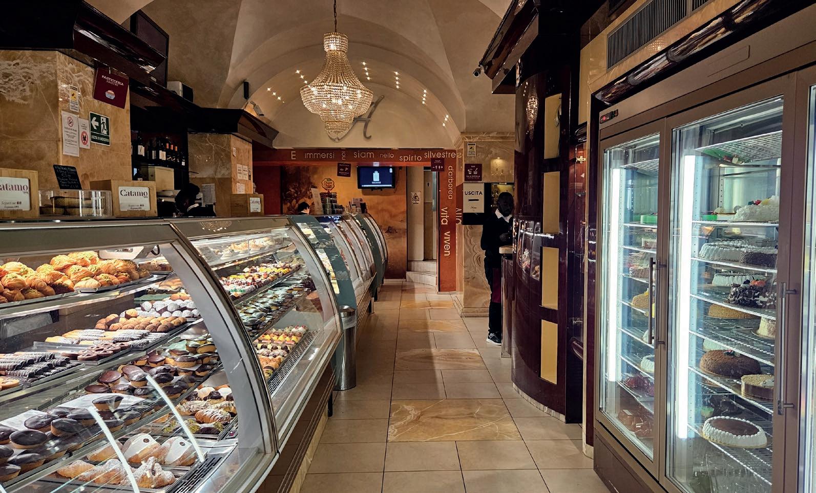 riportandolo ai fasti di un tempo. Mio padre ha creduto in questo progetto fin dal primo momento, investendo in una grande ristrutturazione che ha rispettato la storia del locale, pur conferendogli un tocco personale. Ha voluto valorizzare l’eleganza dei materiali originali, come il legno e i lampadari, ma allo stesso tempo ha introdotto un’importante novità: la vetrina espositiva di dolcetti mignon, che oggi è uno dei tratti distintivi del locale.