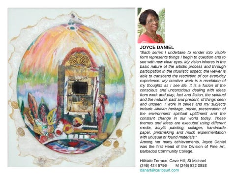 JOYCE DANIEL “Each series I undertake to render into visible form represents things I begin to question and to see with new clear eyes. My vision inheres in the basic nature of the artistic process and through participation in the ritualistic aspect, the viewer is able to transcend the restriction of our everyday experience. My creative work is a revelation of my thoughts as I see life. It is a fusion of the conscious and unconscious dealing with ideas from work and play, fact and fiction, the spiritual and the natural, past and present, of things seen and unseen. I work in series and my subjects include African heritage, music, preservation of the environment spiritual upliftment and the constant change in our world today. These themes and ideas are executed using different media, acrylic painting, collages, handmade paper, printmaking and much experimentation with unusual or found materials.� Among her many achievements, Joyce Daniel was the first Head of the Division of Fine Art, Barbados Community College. Hillside Terrace, Cave Hill, St Michael (246) 424 5796 M (246) 822 0853 danart@caribsurf.com