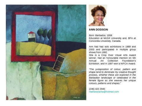 ANN DODSON Born: Barbados, 1958 Education at McGill University and, BFA at Concordia University, Canada. Ann had had solo exhibitions in 1989 and 2000 and participated in multiple group shows from 1992. She is a Crop Over Visual Arts Award winner, had an honourable mention on 5th Annual Art Collection Foundation’s Exhibition, and in 1997 won a NIFCA Award. “The juxtaposition of colour, pattern and shape tend to dominate my creative thought process, whether these are explored in the Barbadian landscape or celebrated in the female figure as she weaves her unique colours, patterns and shapes.” (246) 422 2940 mathewclarke@hotmail.com