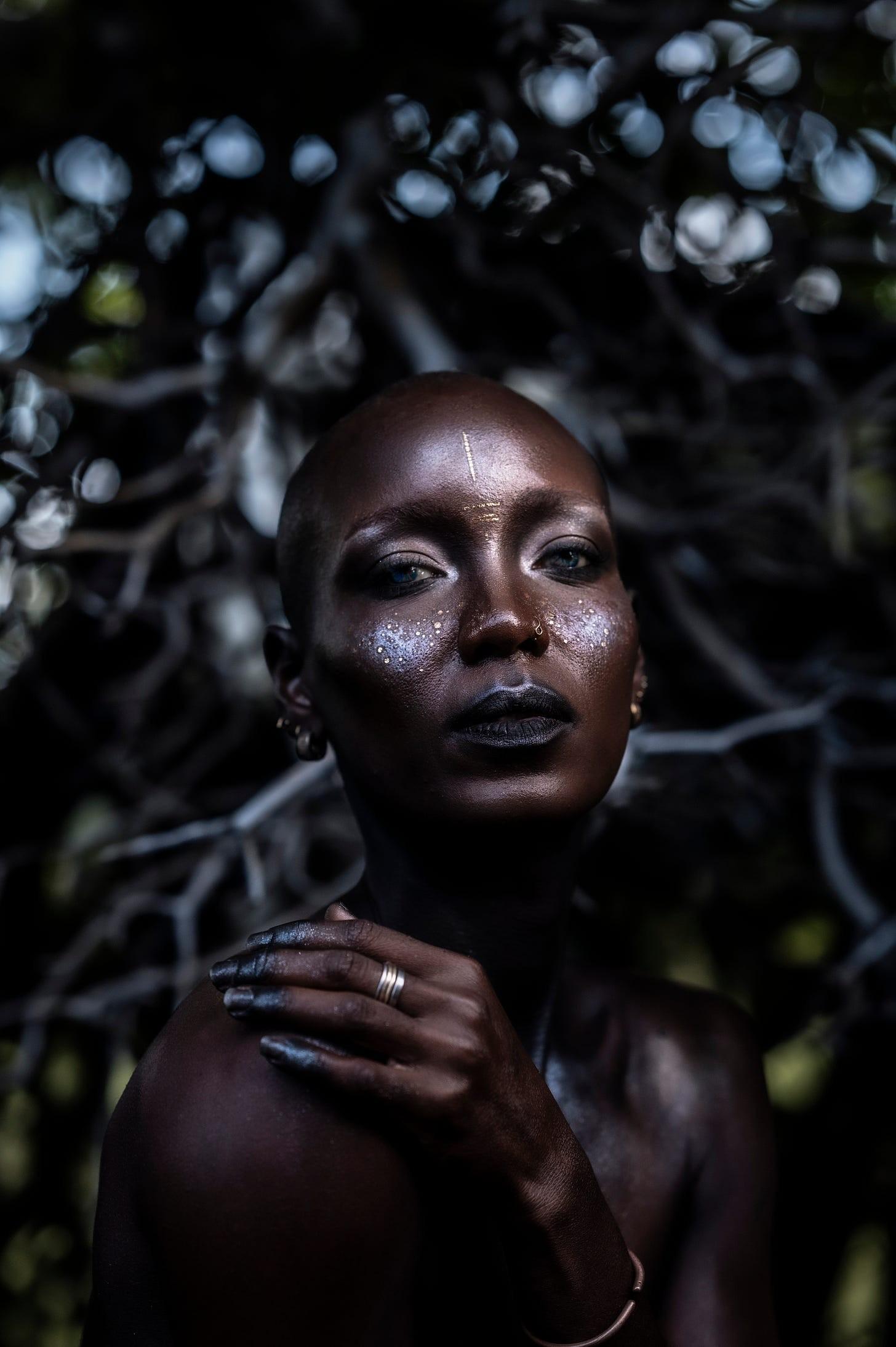 Allyson firmly declines to invade the bush today. The last time she was here — for our Irish Goddess Cethlenn— she wrangled a tree, and the tree wrangled right back. No-one is excited for the possibility of a second allergic reaction, so this time I take on the task of organising the backdrop. Some black gauze in the trees, to mute the afternoon light; some water on the skin, to add to the glow; and one solitary light, tilted downward from camera right.