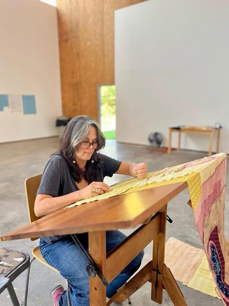 My contribution, a series of ten textile works crafted at Walkers Dairy, Barbados, once a sugar plantation, draws from daily walks, eco-dyeing, and materials foraged from my surroundings. Cerasee, motherwort, bearded fig tree vines, bamboo stalks and shak-shak pods combine with tea-stained and turmeric-tinted linen hymnsheets as quiet offerings. Threads and appliqué trace rituals of tending and remembering, with each piece acting as a secular prayer to and with the land itself.