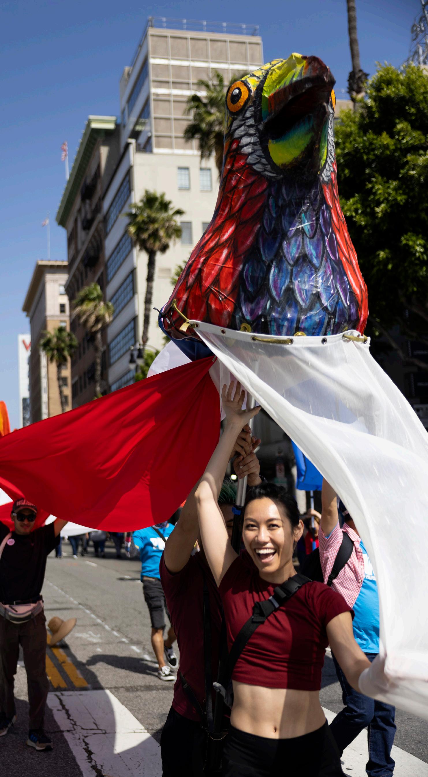 Protesters with the Pilipino Worker Center hold up their mascot Laya, a colorful version of a Pilipino Eagle, during the May Day protest in the neighborhood of Hollywood, in Los Angeles, Calif., on Wednesday, May 1, 2024.