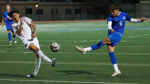 Santa Monica College Corsairs' Jose Urdiano (right) kicks the ball past Norco College Mustangs' Andrew Montes (left).
