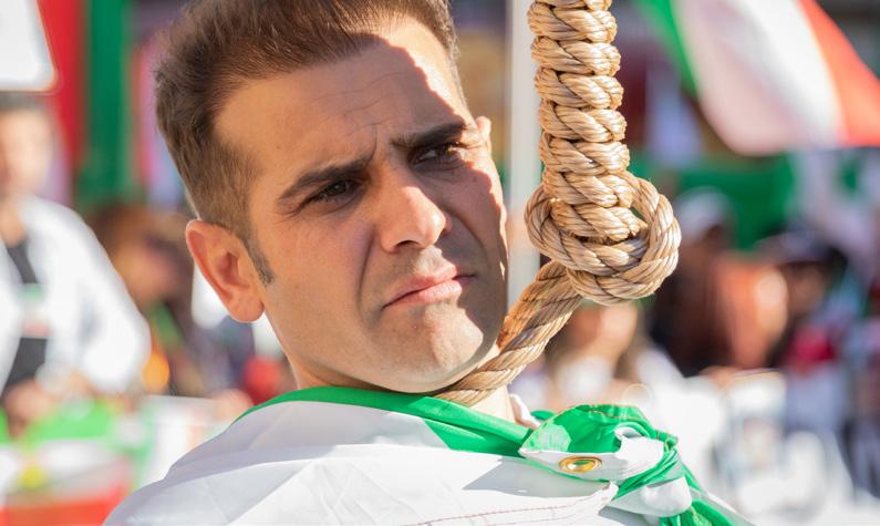 A noose tied around the neck of rally goer at the Freedom for Iran rally in Hollywood, Calif, on Sat., Nov. 19. He is wearing a sign which reads, "guilty of wanting human rights."