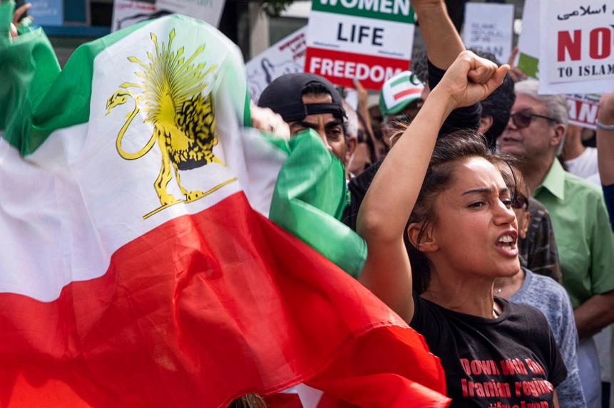 (Left) Solmaz Atash chants “zan, zendegi, azadi,” which means “woman, life, freedom,” at the March for Iran, at Third Street Prome nade in Santa Monica, Calif., on Sat., Oct. 8.